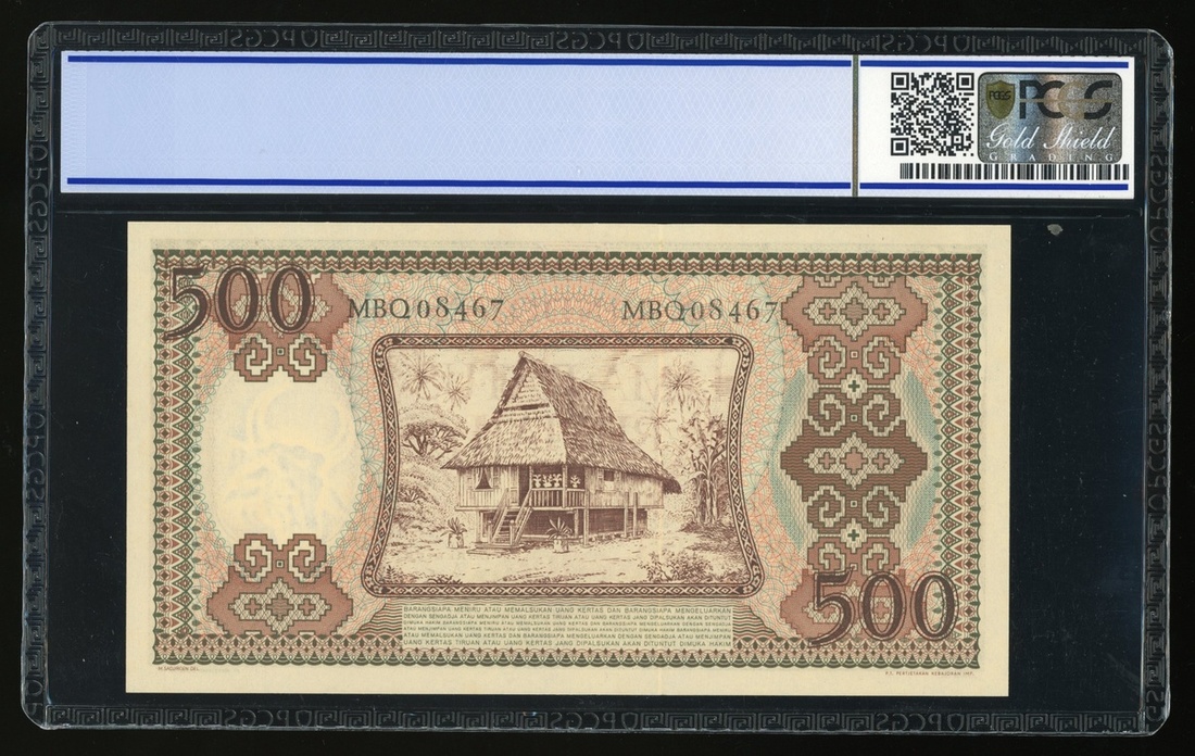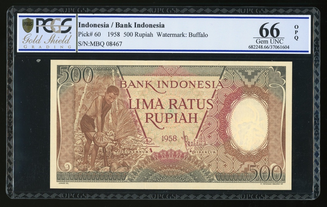 Bank Indonesia, 500 rupiah, 1958, serial number MBQ 08467, (Pick 60), PCGS Gold Shield Grading 66OPQ Gem UNC