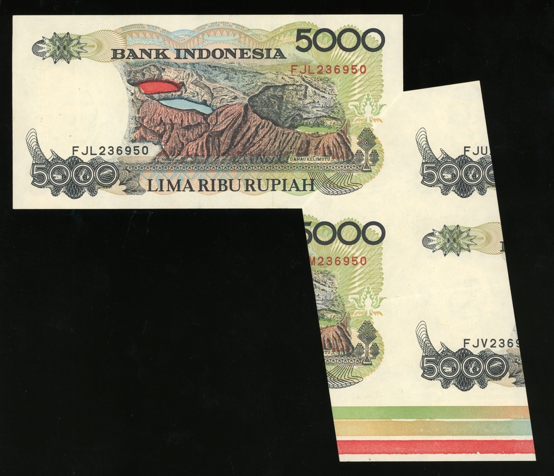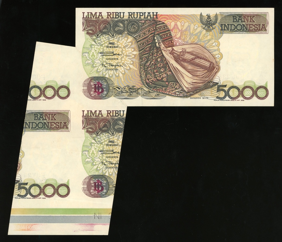 Indonesia, 5000 rupiah, 1992, Cutting Error, serial number FJL236950, (Pick 130a), about uncirculated, rare seen.