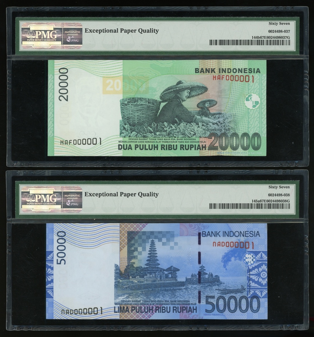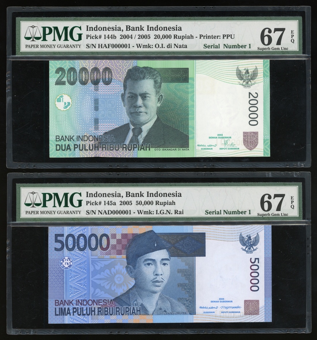 Bank Indonesia, a pair of 20000 rupiah, 2004/2005 and 50000 rupiah, 2005, identical lucky serial number HAF 000001 and NAD000001, (Pick 144b and 145a), both graded PMG 67EPQ Superb Gem Uncirculated (2).