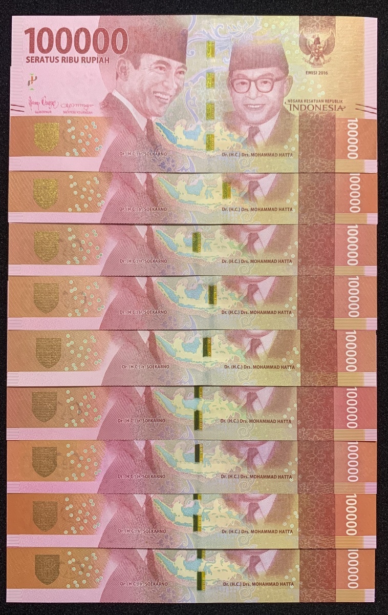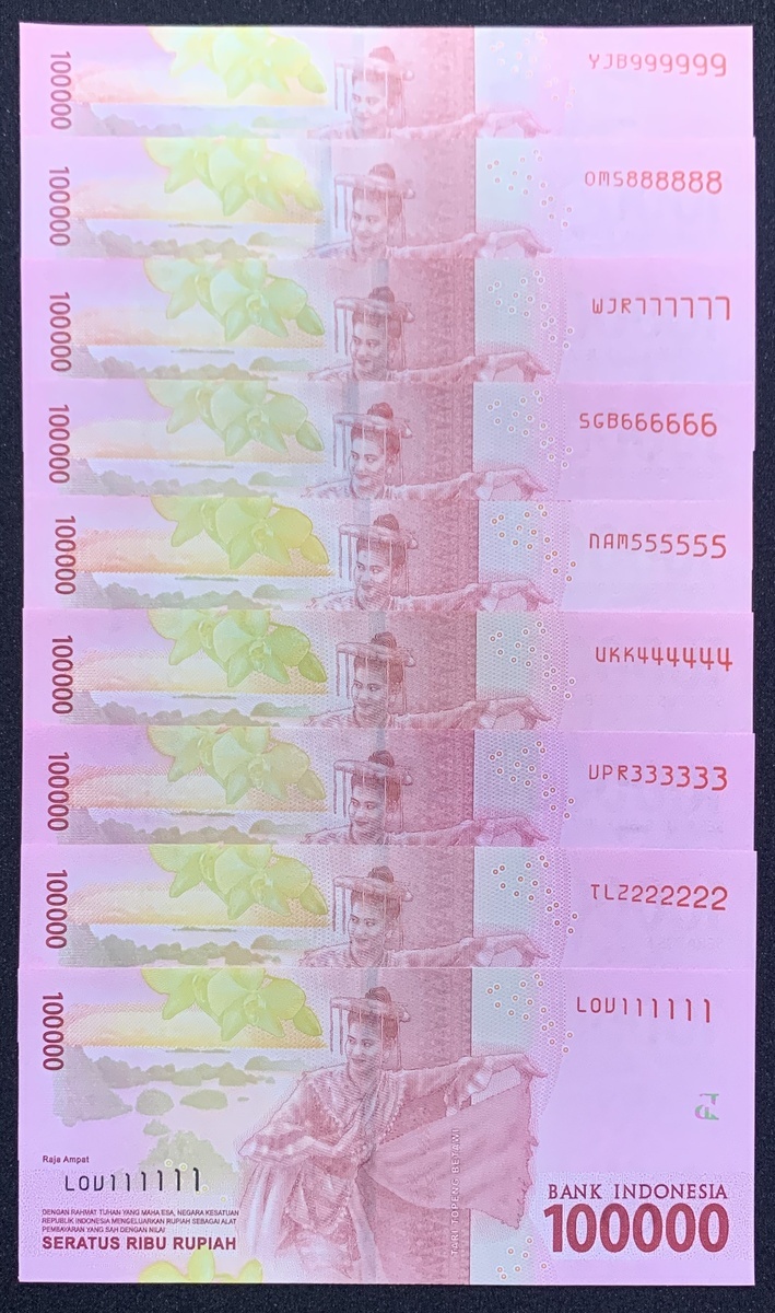 2016年印尼銀行100000印尼盾一組9枚,幸運號LOU111111, TLZ222222, UPR333333, UKK444444, NAM555555, SGB666666, WJR777777, OMS888888 及 YJB999999,均UNC