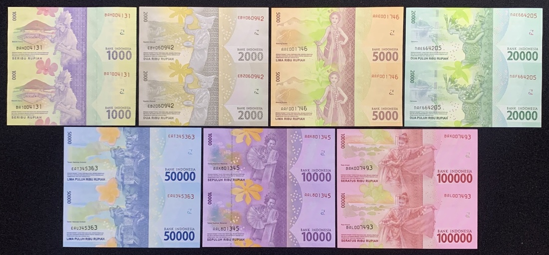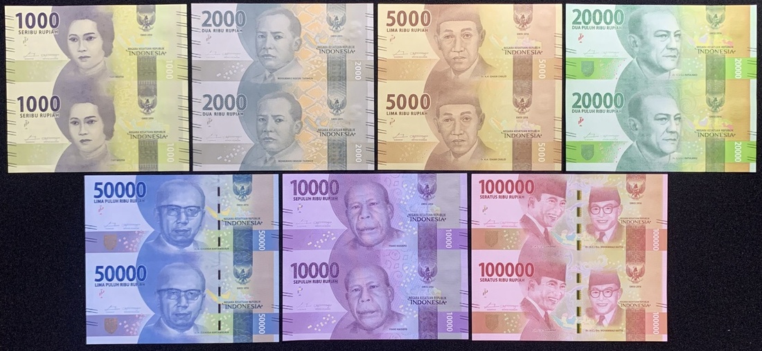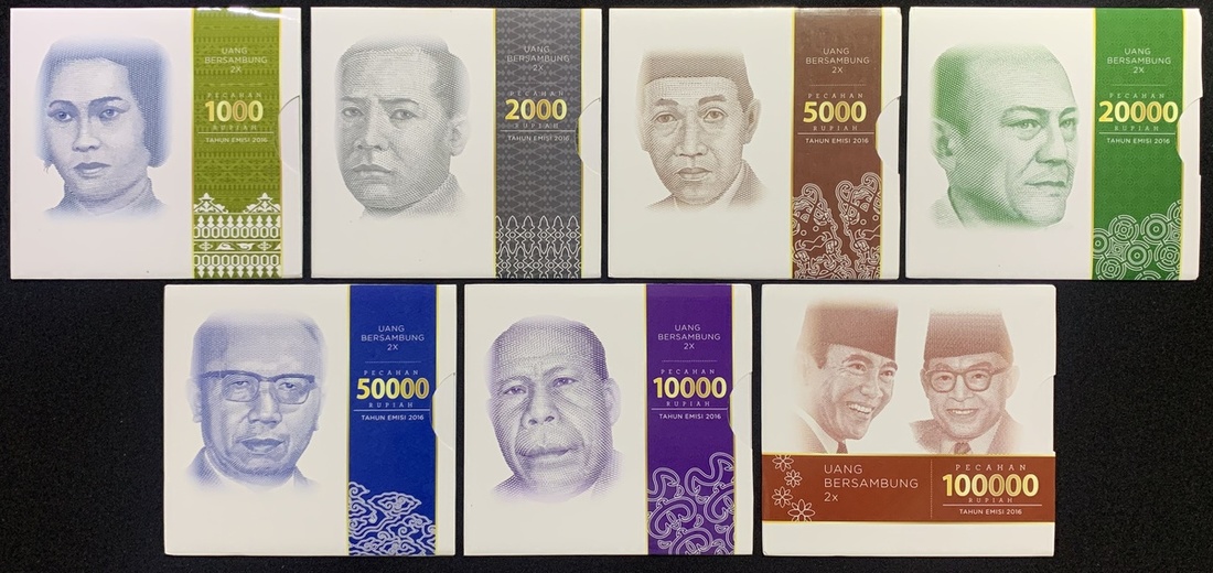 Bank Indonesia, a group of 7x uncut sheet of 2, consists of 1000 rupiah, 2000 rupiah, 5000 rupiah, 10000 rupiah, 20000 rupiah, 50000 rupiah and 100000 rupiah, 2016, serial numbers BAH/I 004131, EBY/Z 060942, AAE/F 001746, NAE/F 664205, EAT/U 345363, AAK/L 801345 and BAK/L 007493, (Pick 154-160), all uncirculated, with original packaging (7 sets)