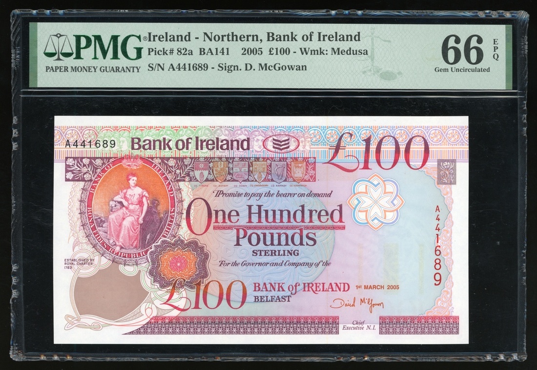 2005年北愛爾蘭100鎊,編號A441689,PMG 66EPQ