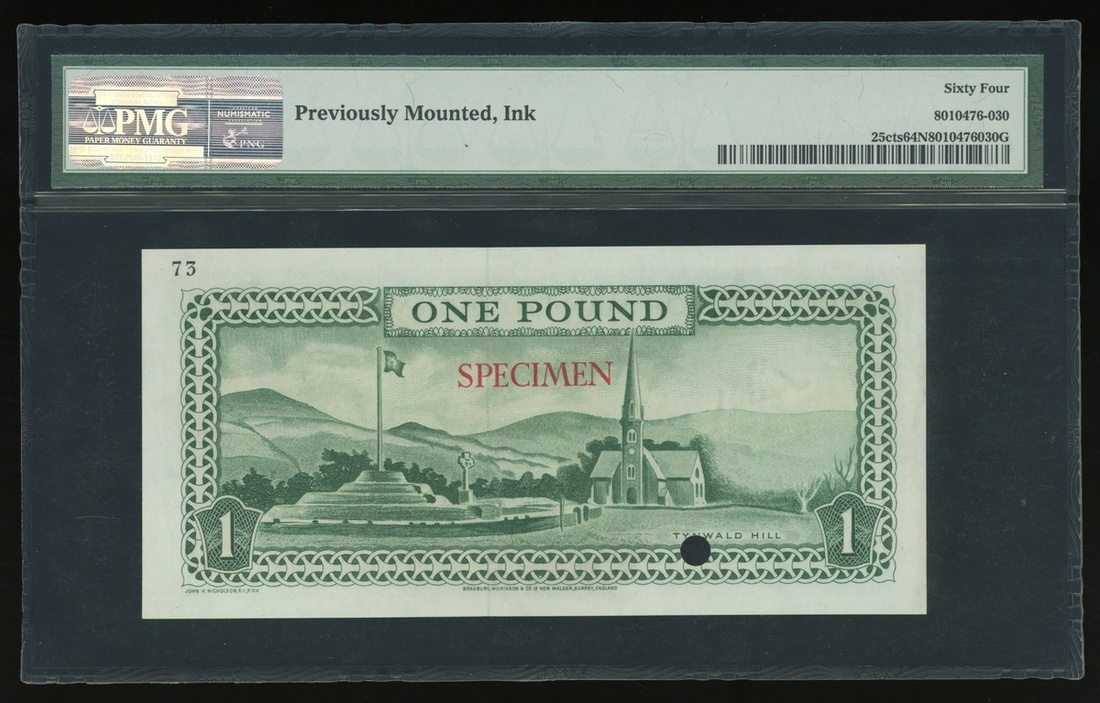 1961年曼島1鎊試色樣票,控號73,PMG 64NET,有黏貼痕跡及有墨
