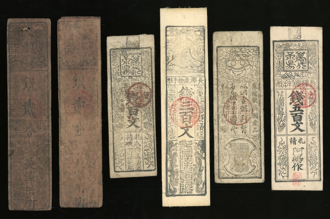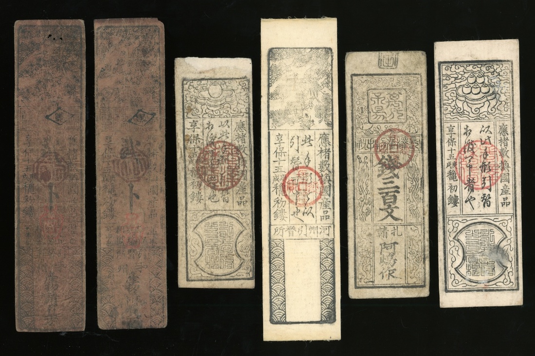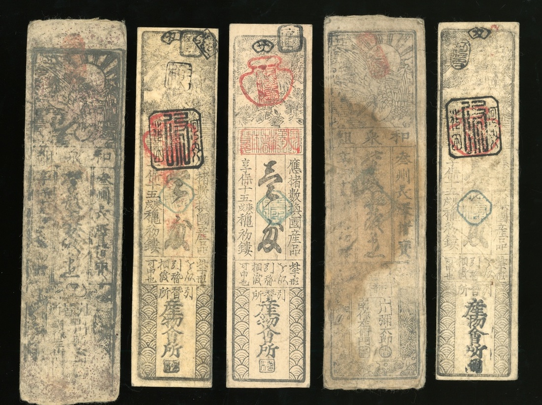 Japanese Hansatsu, a selection a selection comprising Mikawa Province Nagasawa 100, 300 (2) and 500 mon, 1730, gin 1 mon (5), 1730, and gin 2 fun (2) for issue at the Nagasawa Yosho Office