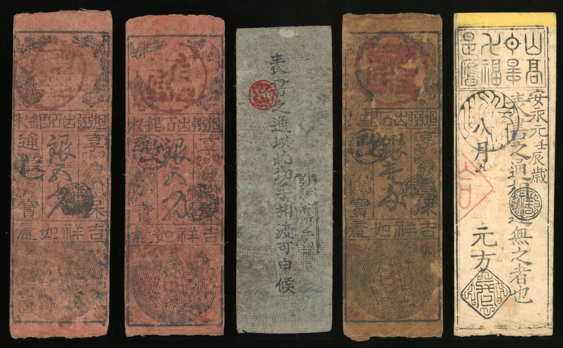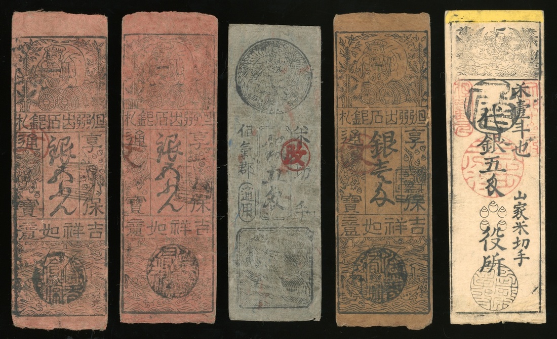 Japanese Hansatsu, a selection of 11x, comprising Tamba Province, Shingo, 1 mon (2), Kameyama Han, 100 mon, 1748, Sonobe Han, 1 fun 'Kyoho', Yamaga Han, 5 mon, 1772, Tajima Province, Sugihara Han, 5 mon (2), Izushi Han 5 fun (2), 1730-, Kyoho issue, 1 mon, Koide issue 5 mon