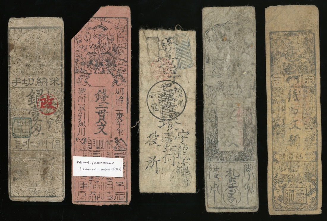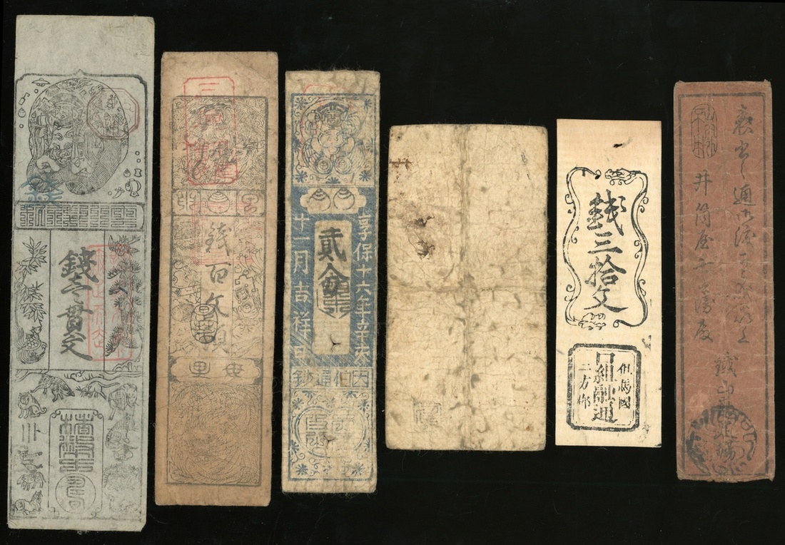 Japanese Hansatsu, a selection of 11x, comprising Tajima Province, Minakami issue, 1 mon, 3000 mon, 1870, Futakata issue 30 mon, Tango Province, Mizayu issue 100 mon, Kaga Province, Kanazawa issue 50 mon, 1868, Inaba Province, Tottori issue, 2 fun, 1731, Izumo Province, Mori Han, 1 and 100 mon, Izumo Province, Matsue issue 1 mon, 1675 (?) and 1000 mon, late 1790's, Urymura issue 1 mon, 1857