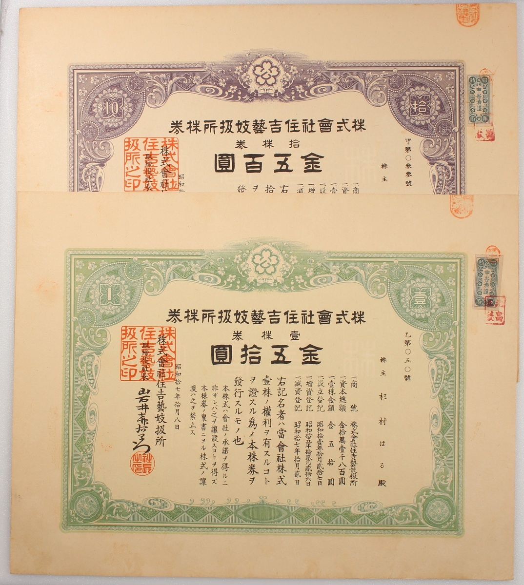 日本住吉藝妓扱所株券2枚,分別金伍拾圓及金伍百圓,編號050,AU,保存完好