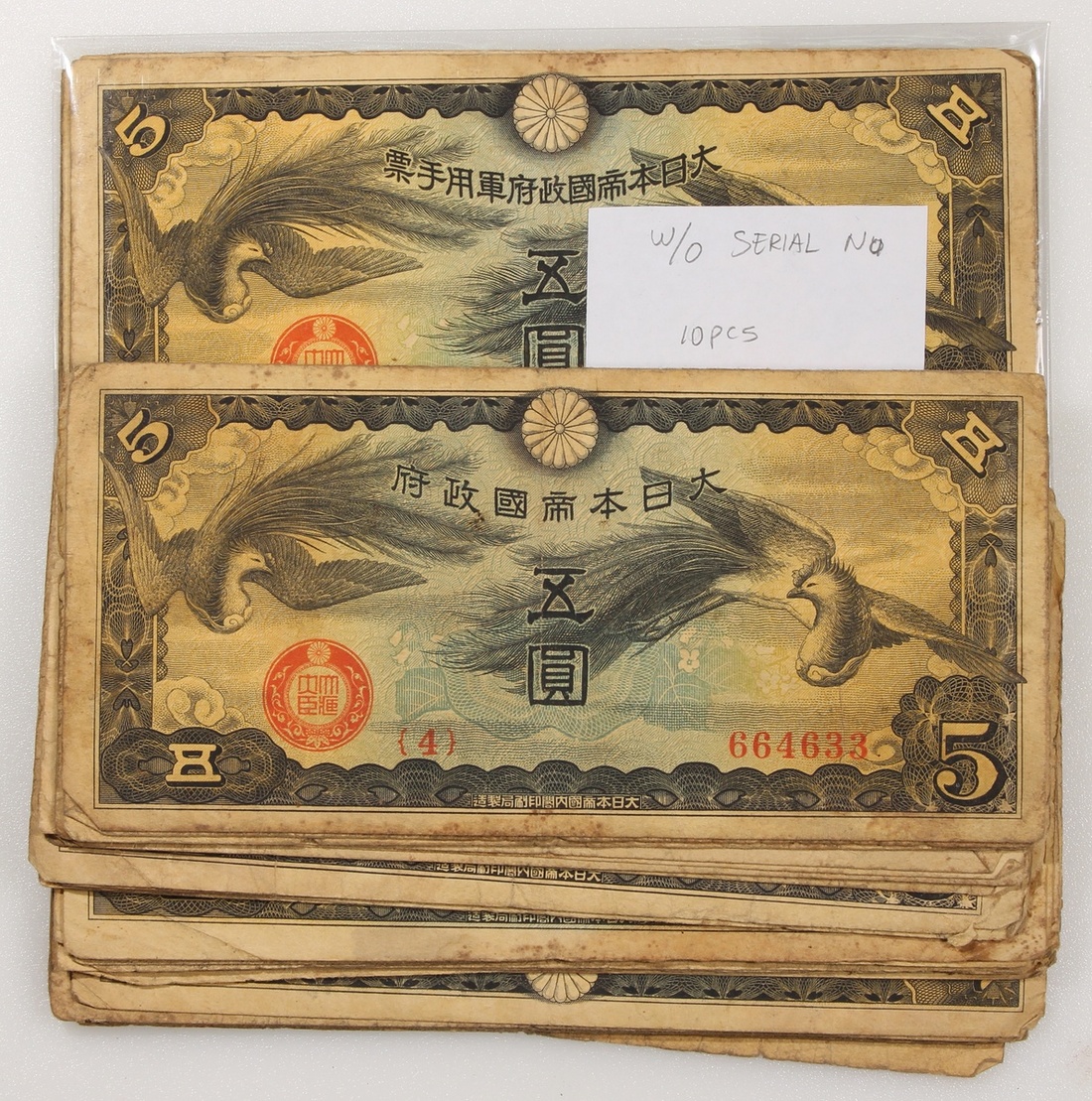 Japanese Imperial Government, a group of 50x 5 yen, consists of 10x without serial number, the rest with random block and serial numbers, (M17 and M18), fine to very fine, viewing recommended (50).