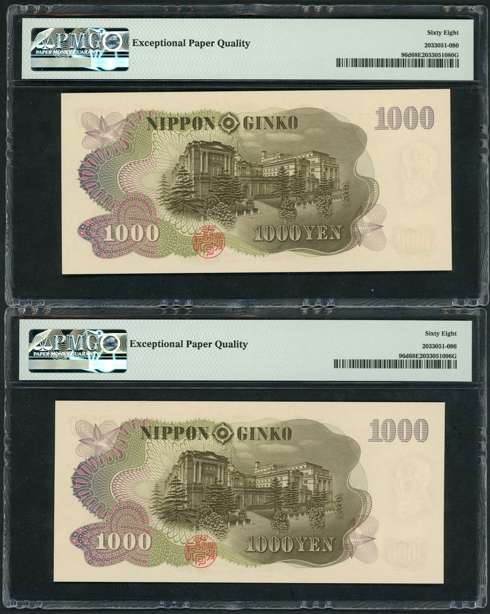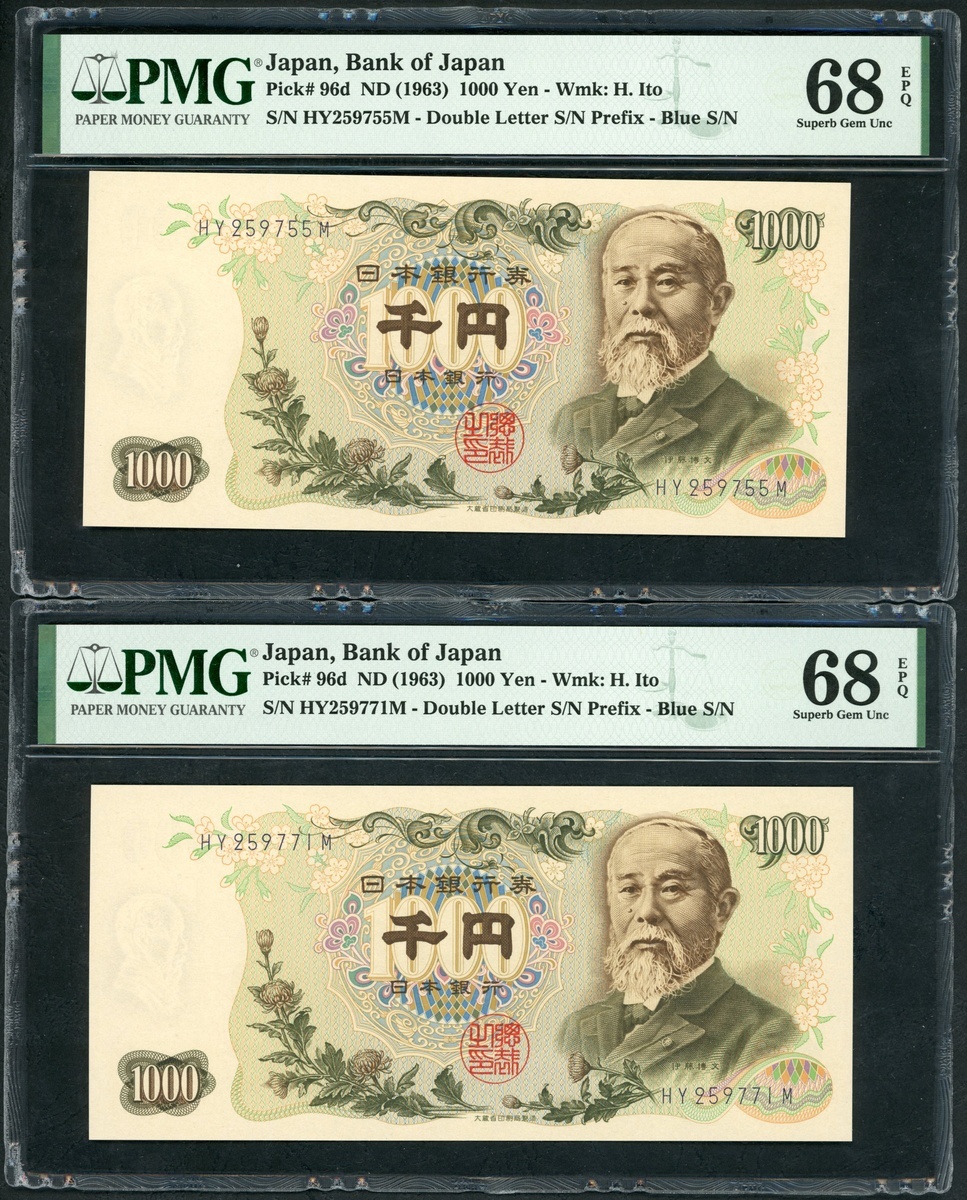 Bank of Japan, a pair of 1000 yen, ND(1963), serial numbers HY259755M and HY259771M, (Pick 96d), both graded PMG 68EPQ Superb Gem Uncirculated (2).