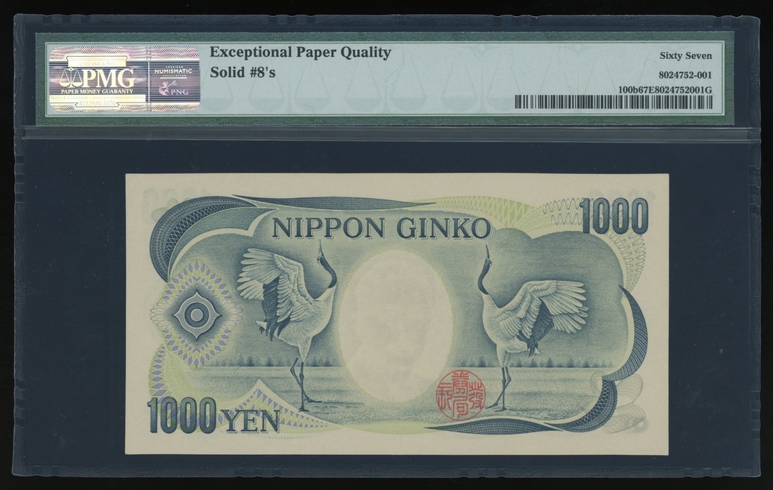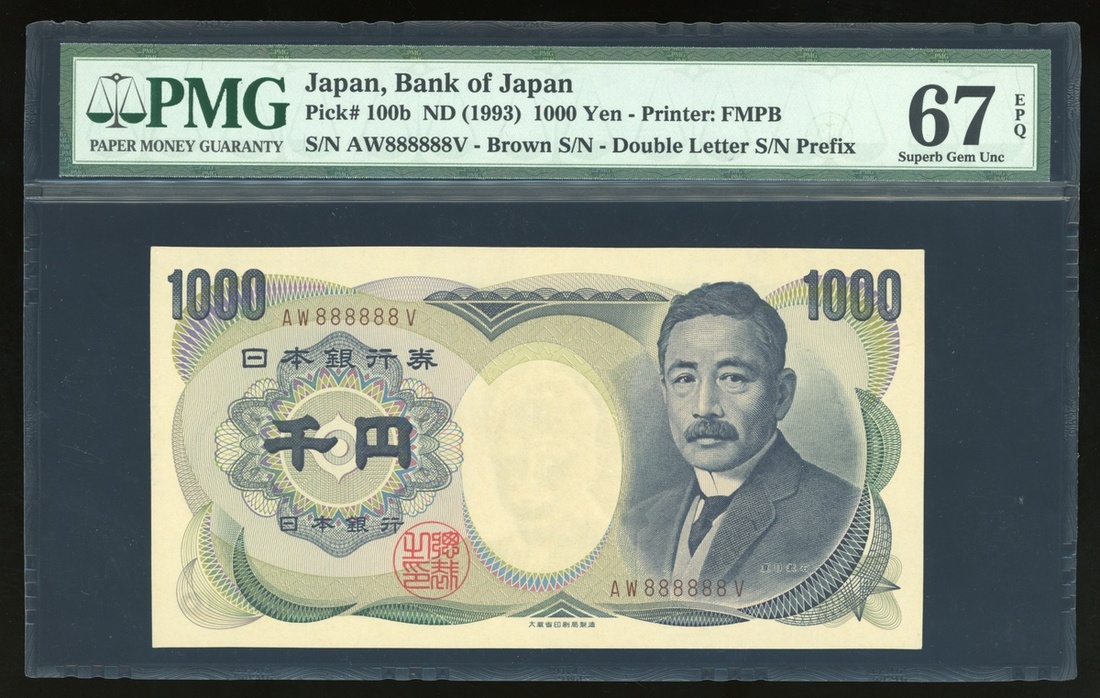 Bank of Japan, 1000 yen, ND(1993), solid serial number AW888888V, (Pick 100b), PMG 67EPQ Superb Gem Uncirculated.