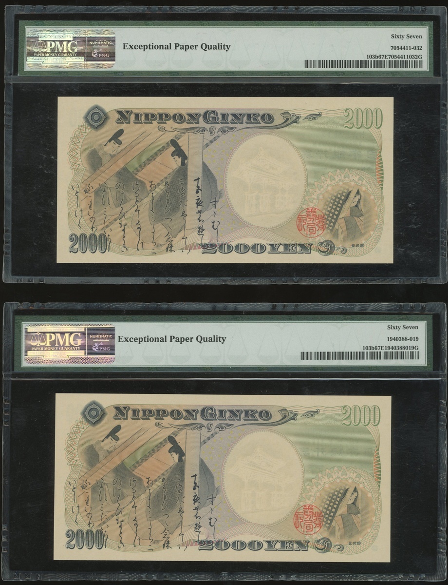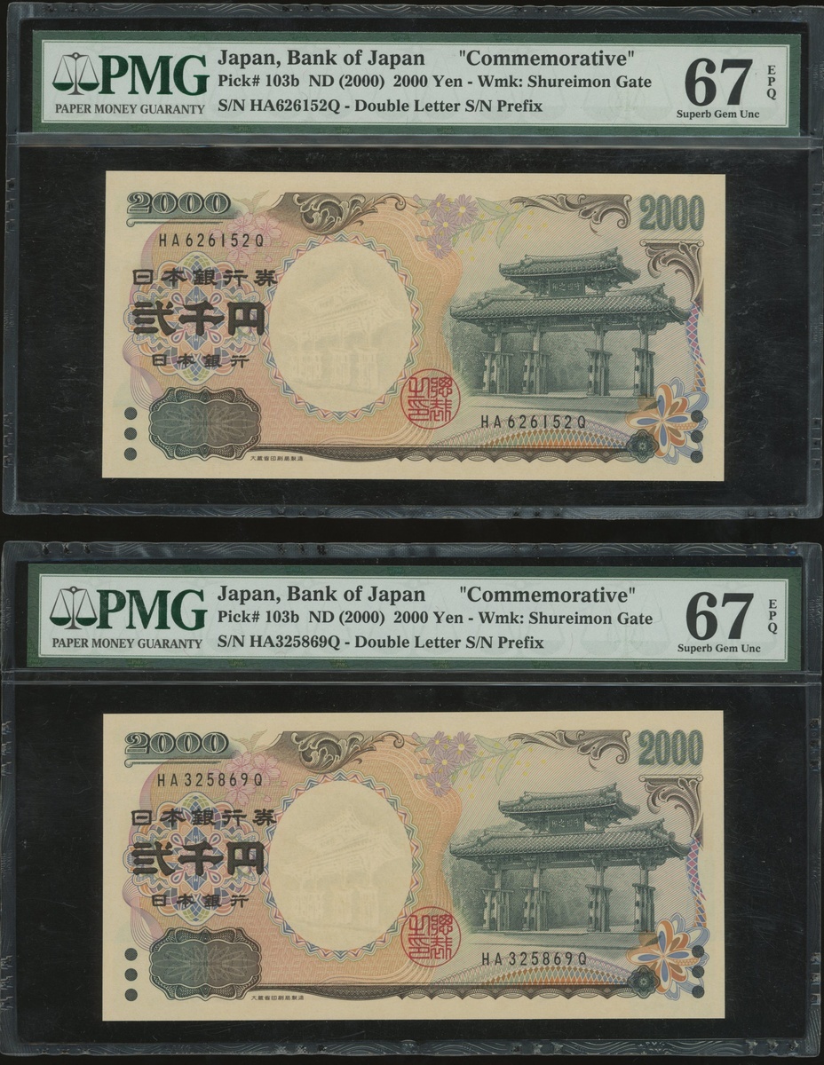 Bank of Japan, a pair of 2000 yen, ND(2000), double letter prefix HA325869Q and HA626152Q, (Pick 103b), both graded PMG 67EPQ Superb Gem Uncirculated (2).