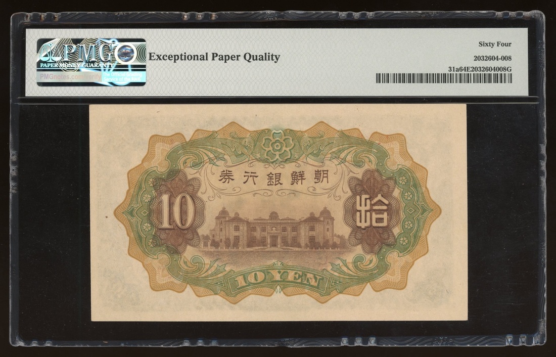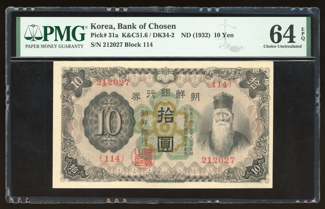 Bank of Chosen, Korea, 10 yen, ND (1932), serial number 212028 {114}, (Pick 31a), PMG 64EPQ Choice Uncirculated