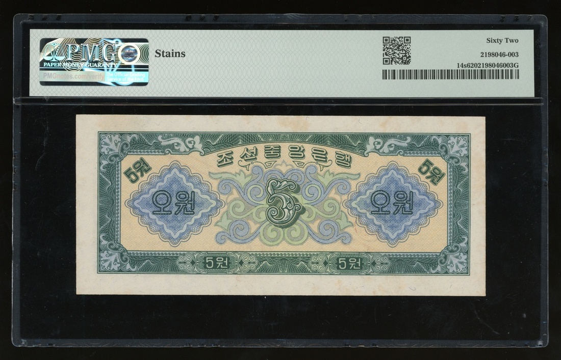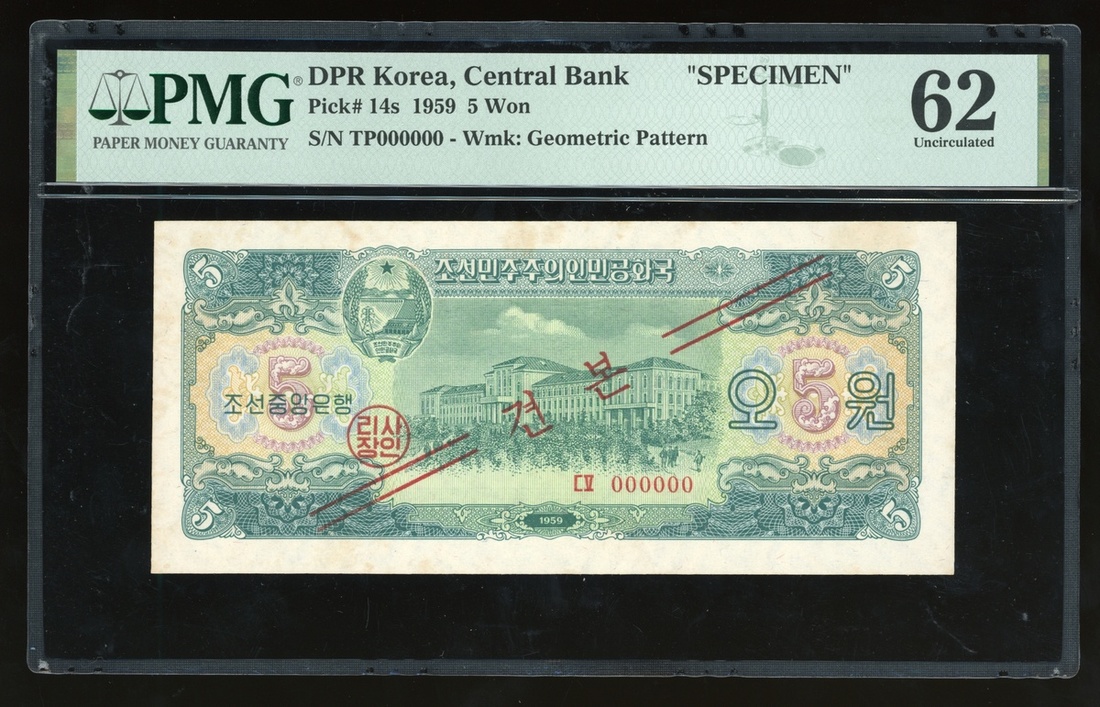 1959年朝鮮中央銀行5圜樣票,TP000000,PMG 62,有漬,罕見版別