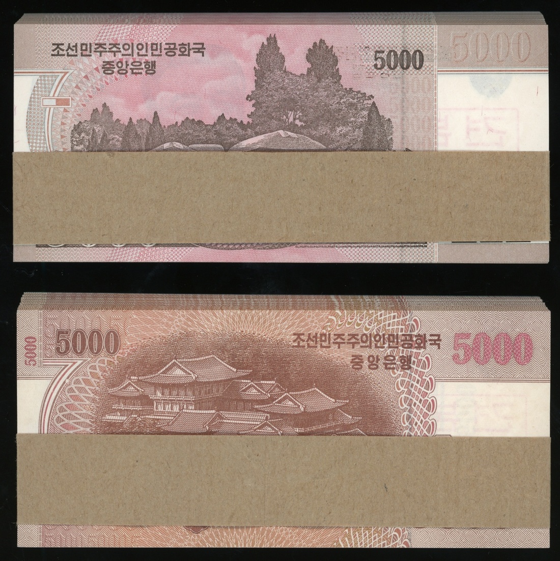 North Korea, two consective run of 100x 5000 won, specimen, 2008 and 2013, serial numbers 0000000, (Pick 66as and 67s), uncirculated, with original wrapper (200).