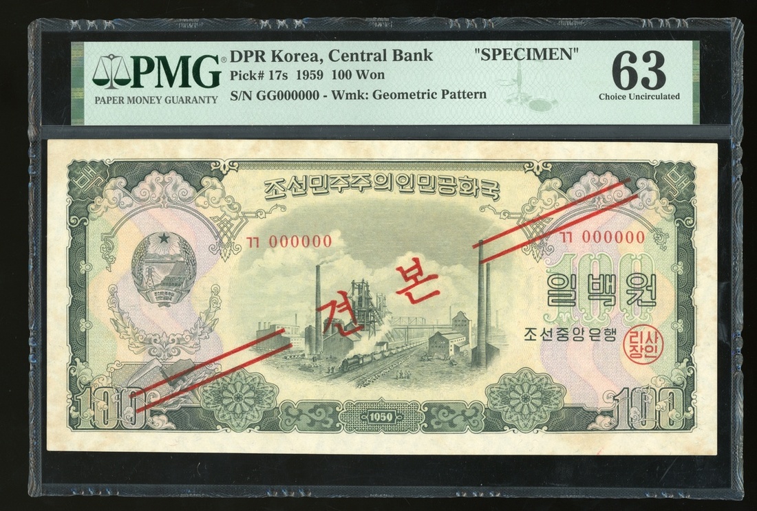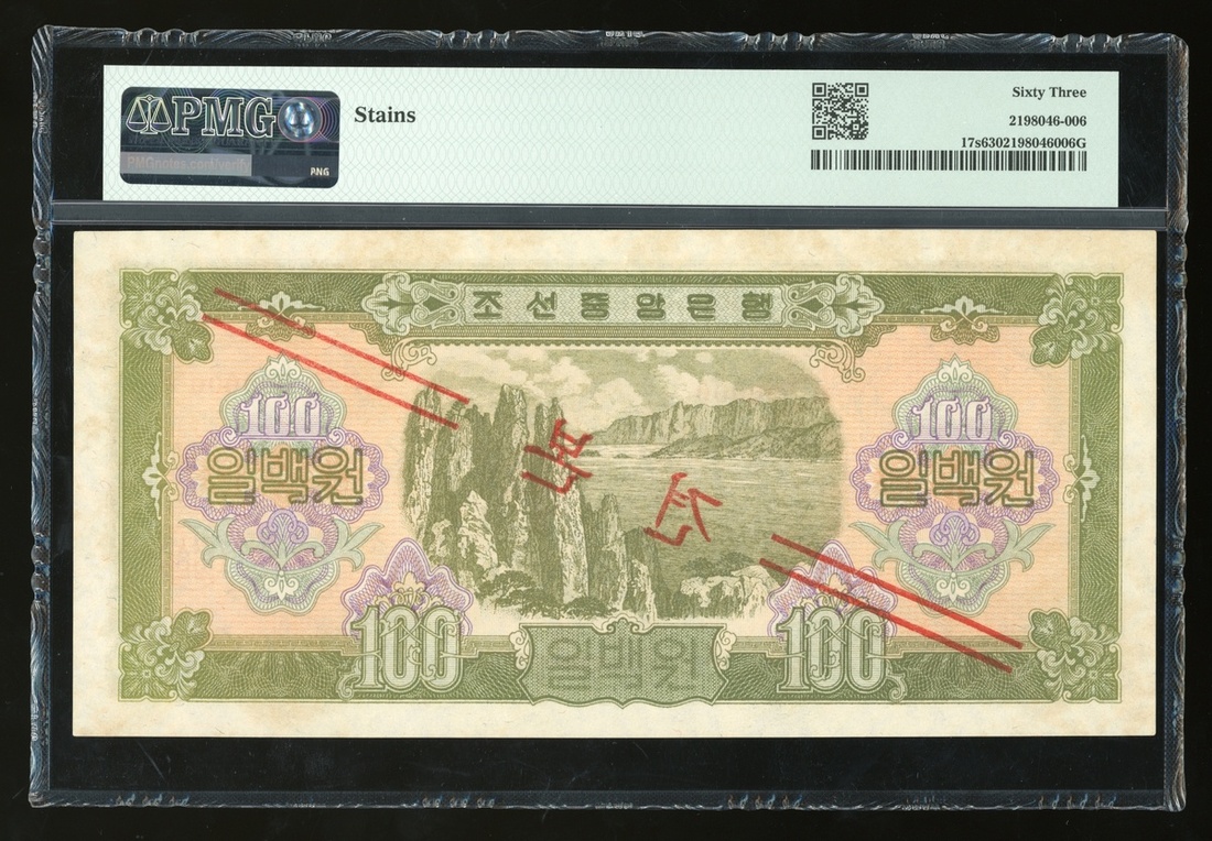 1959年北韓100圜樣票,編號GG000000,PMG 63,有潰,此系列最高面值,罕見樣票
