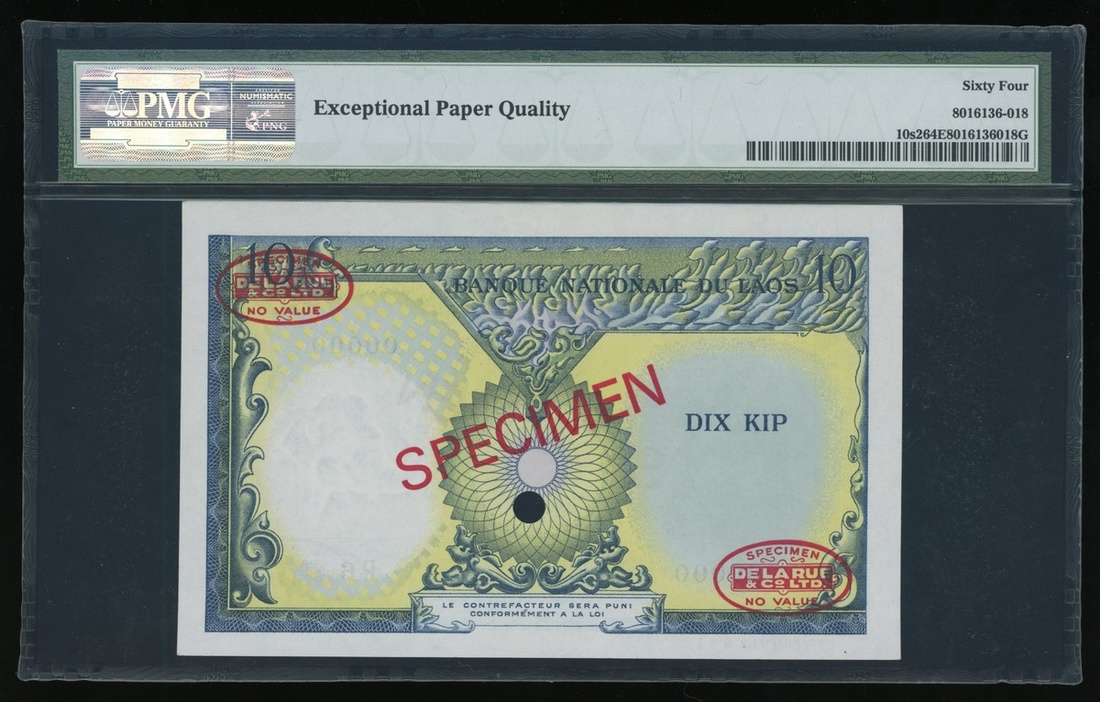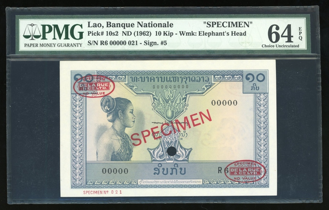 Banque Nationale Du Laos, 10 kip, ND (1962), specimen, serial number R6 00000, specimen number 021,