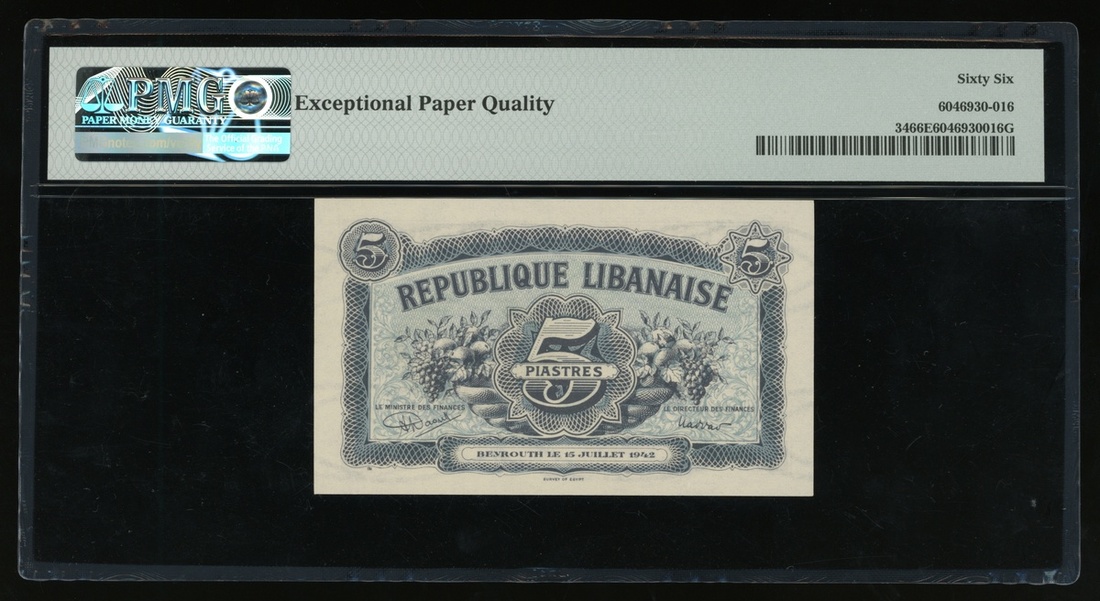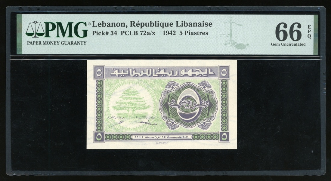 1942年黎巴嫩5元,無編號,PMG 66EPQ