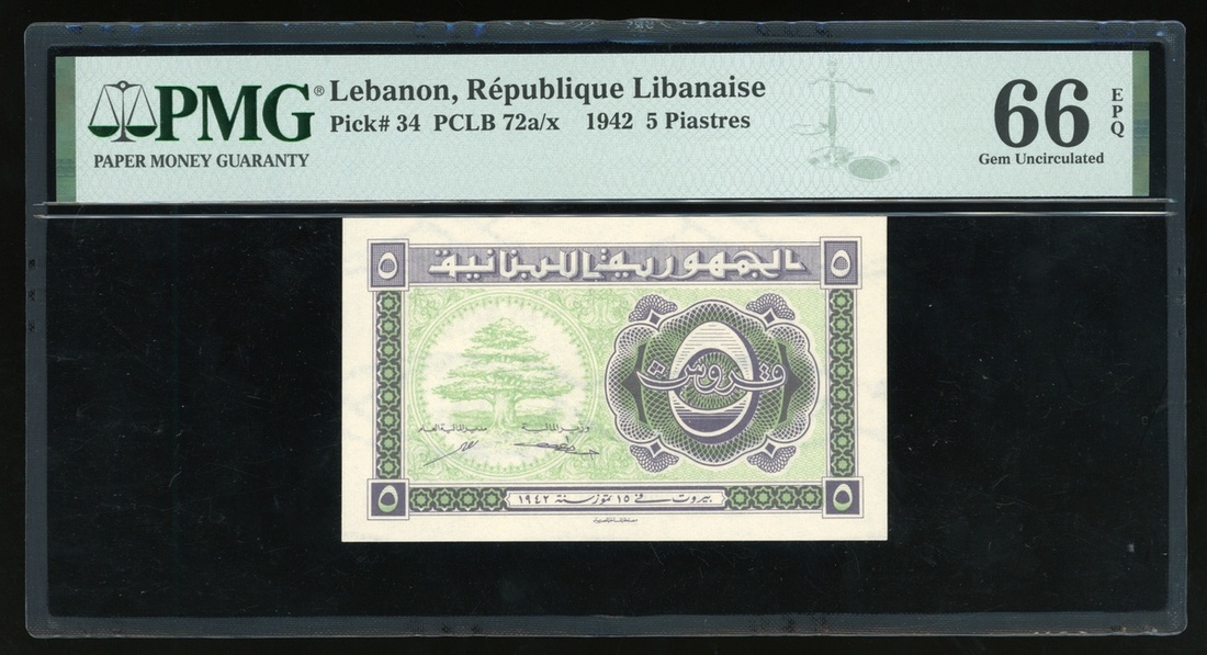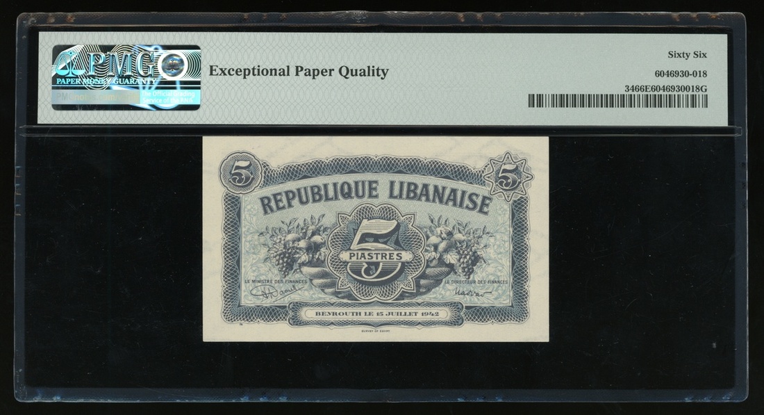 1942年黎巴嫩5元,無編號,PMG 66EPQ