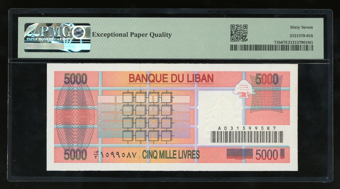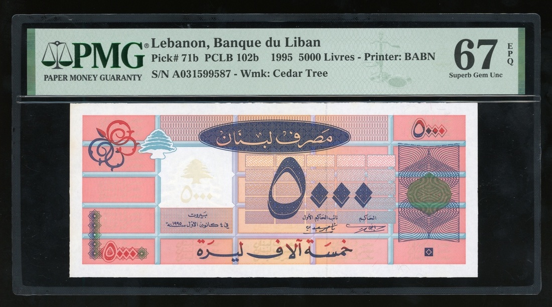 Banque du Liban, Lebanon, 5000 livres, 1995, serial number A031599587, (Pick 71b), PMG 67EPQ Superb Gem Uncirculated
