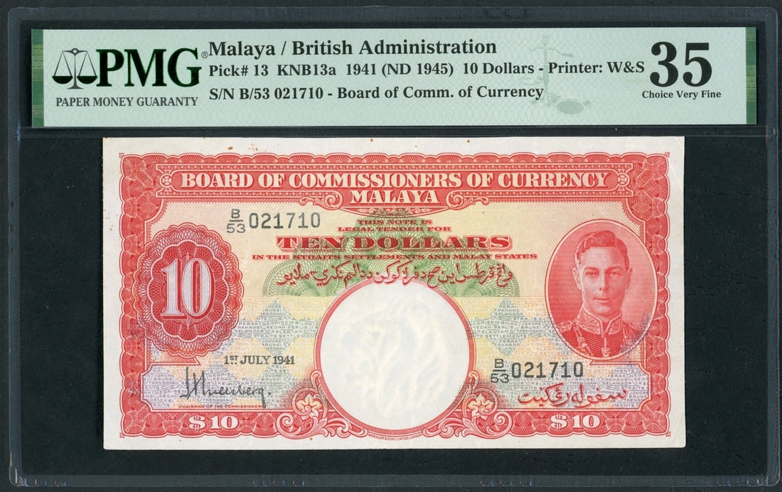 Board of Commissioners of Currency Malaya, $10, 1 July 1941, serial number B/53 021710, (Pick 13), PMG 35 Choice Very Fine (minor rust)