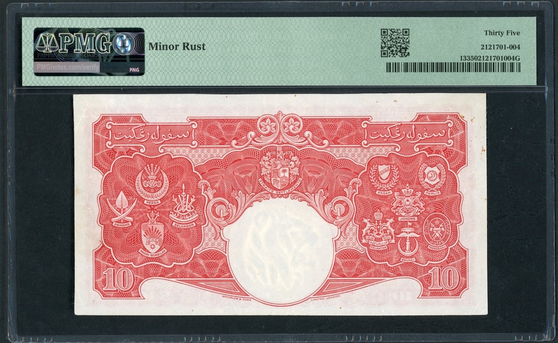 1941年馬來亞貨幣發行局10元,編號B/53 021710,PMG 35,輕微銹漬
