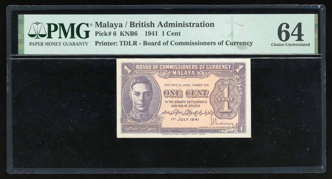 Board of Commissioners of Currency, Malaya, 1 cent, 1941, no serial numbers, (Pick 6), PMG 64 Choice Uncirculated