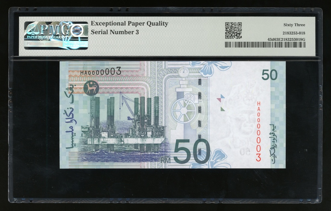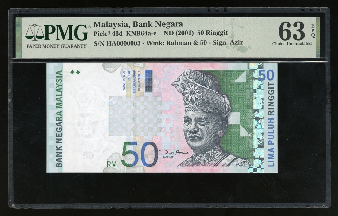 2001年馬來西亞50令吉,細編號HA0000003,PMG 63EPQ