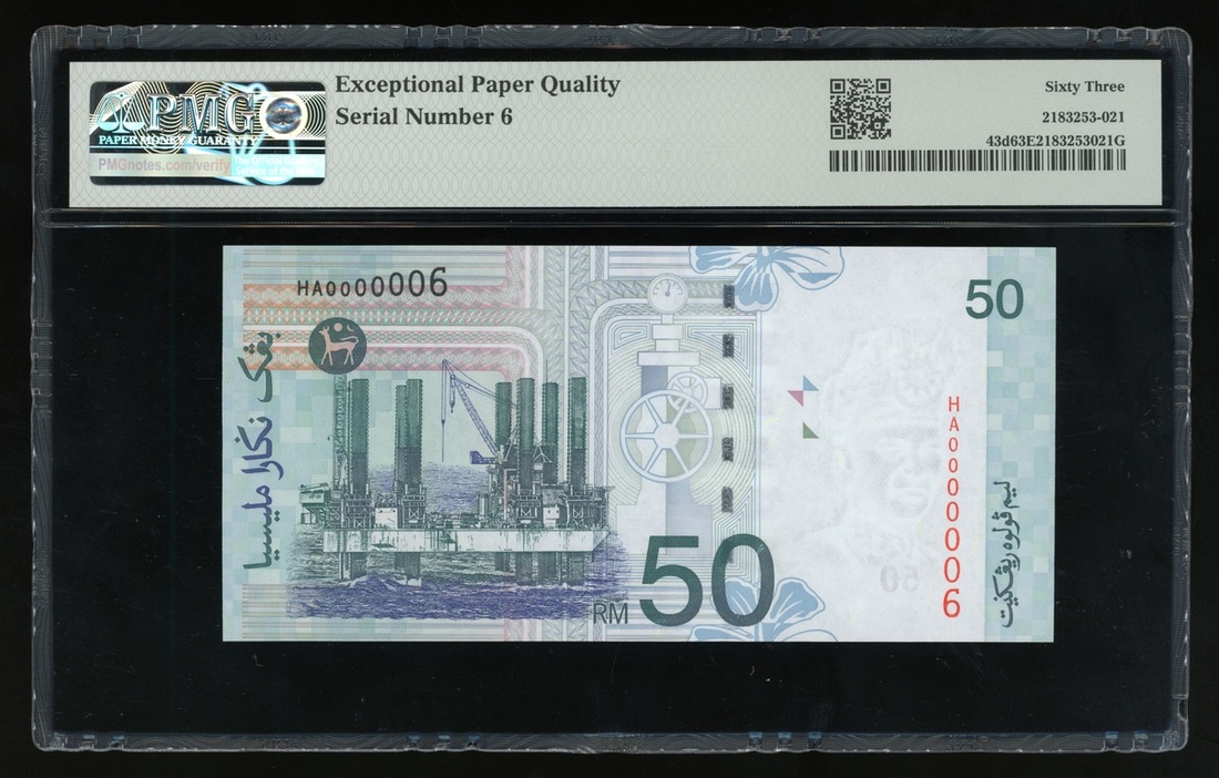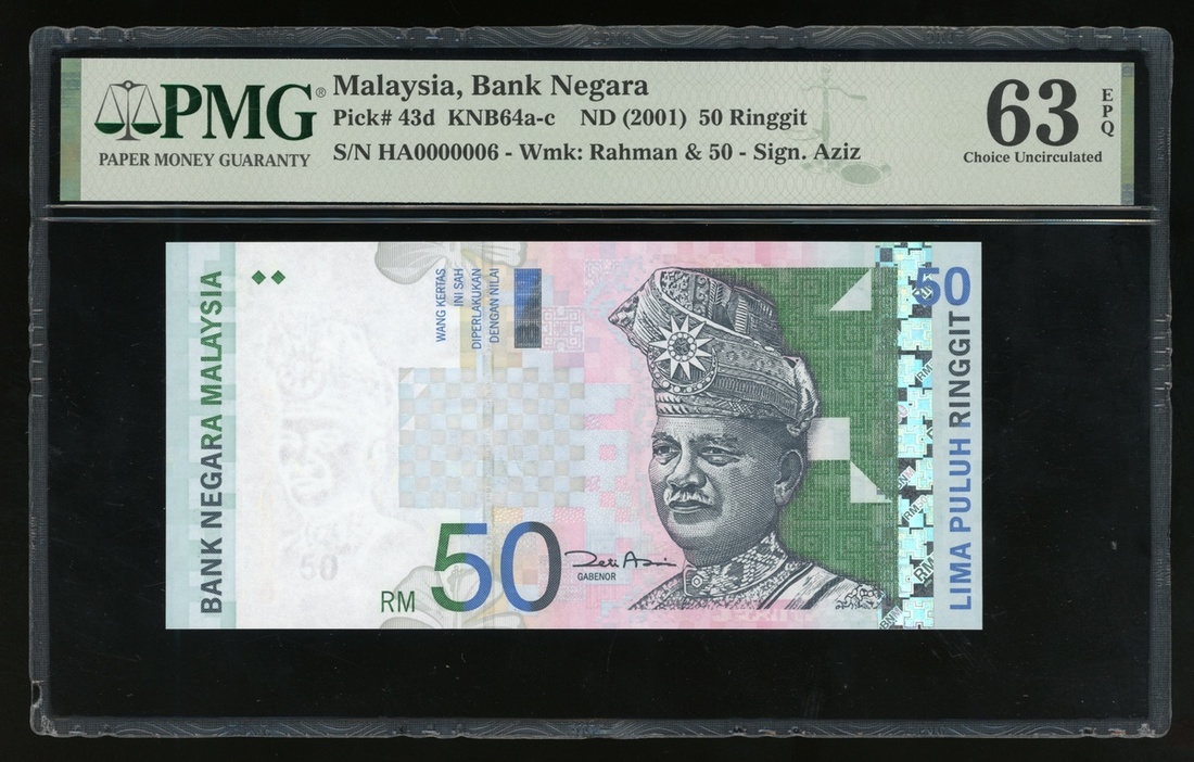 2001年馬來西亞50令吉,細編號HA0000006,PMG 63EPQ