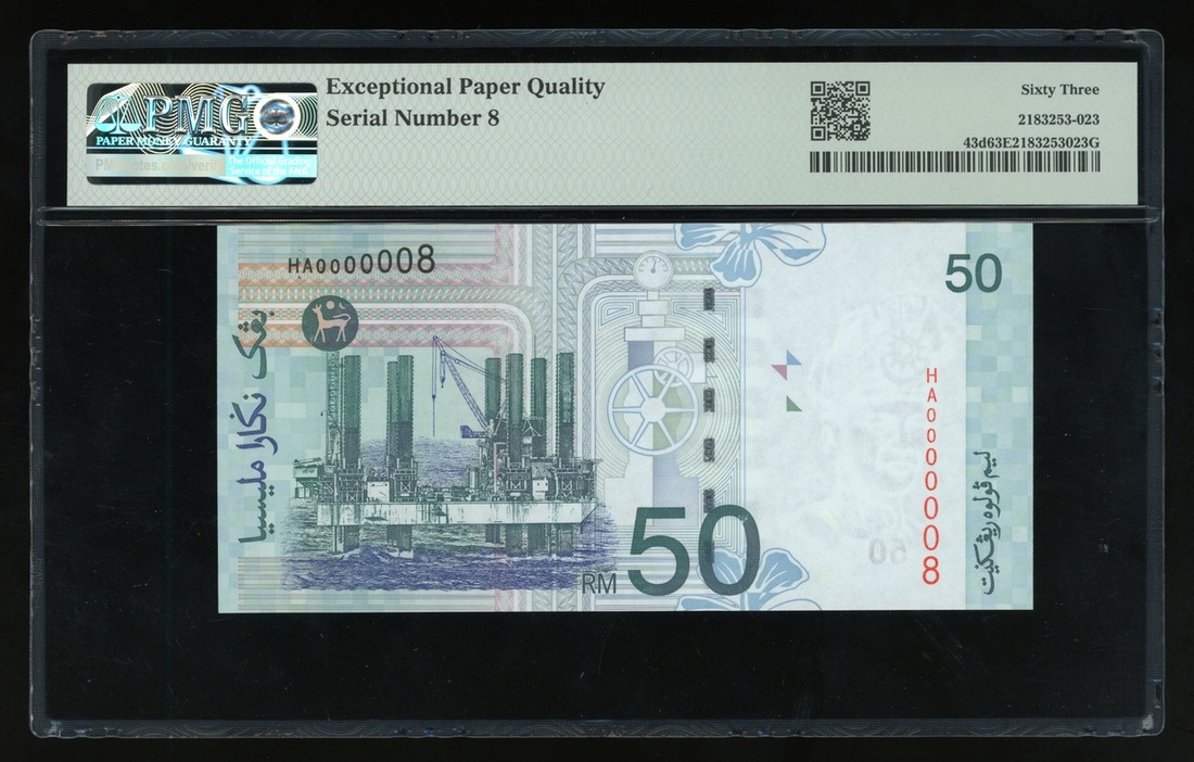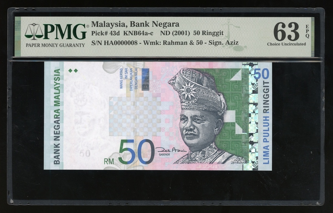 2001年馬來西亞50令吉,細編號HA0000008,PMG 63EPQ