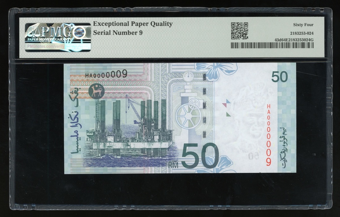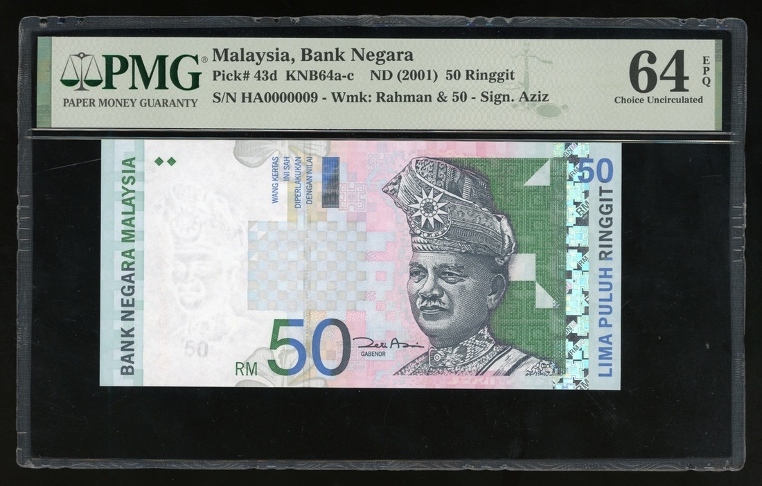 2001年馬來西亞50令吉,細編號HA0000009,PMG 64EPQ