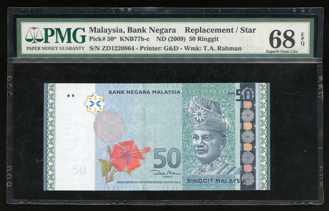 Bank Negara, Malaysia, 50 ringgit, replacement, ND(2009), serial number ZD1220864, (Pick 50*), PMG 68EPQ Superb Gem Uncirculated.