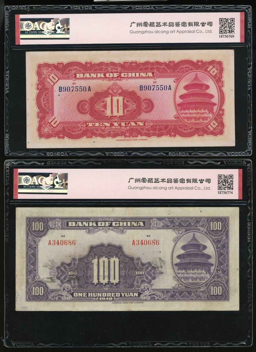 China, a group of 5 notes, consists of: Bank of China, a pair of 10 yuan and 100 yuan, Year 29(1940), serial numbers B907550A and A340686,