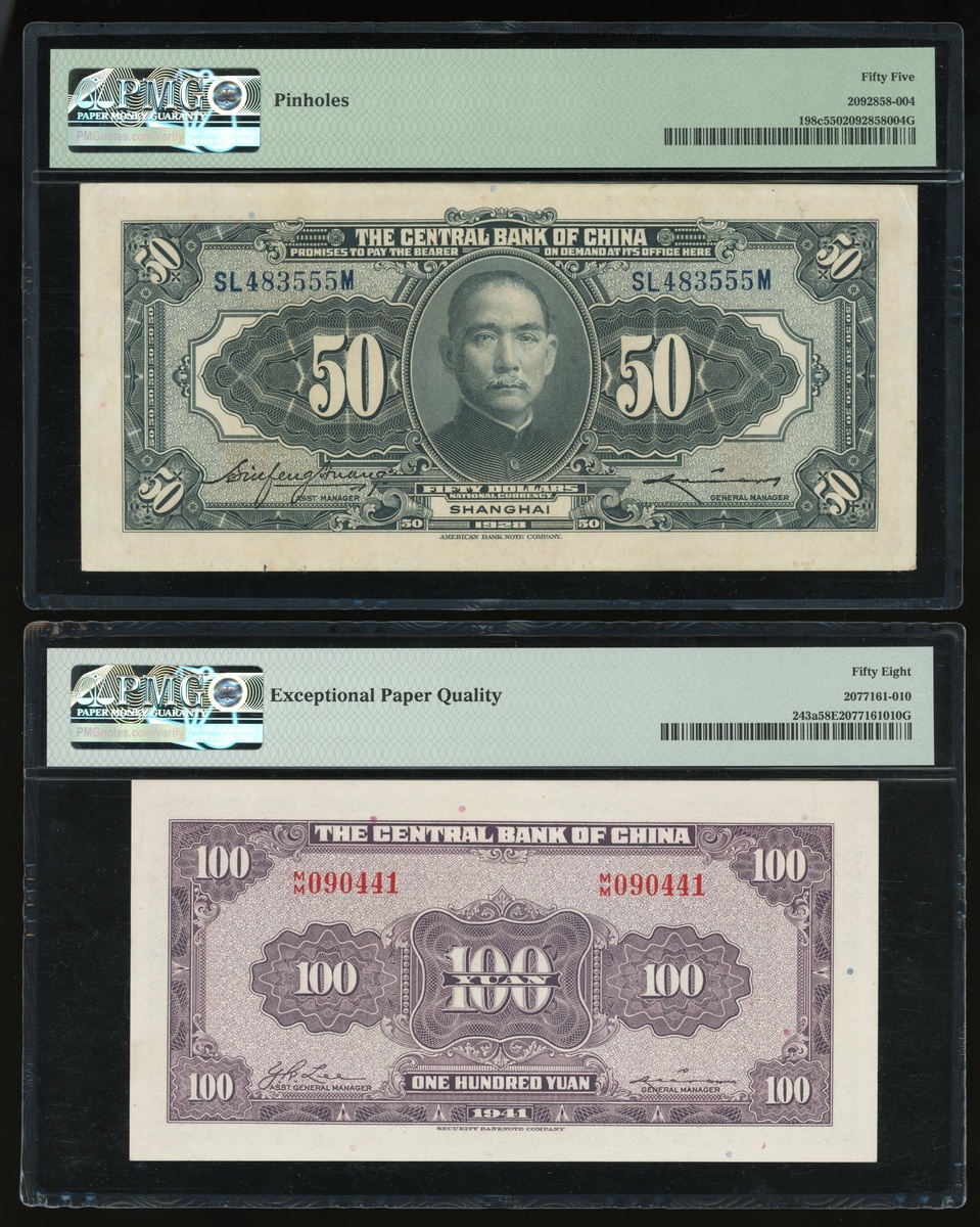 Central Bank of China, a pair of $50 and 100 yuan, Year 17(1928) and Year 30(1941), serial numbers SL483555M and M/M 090441,