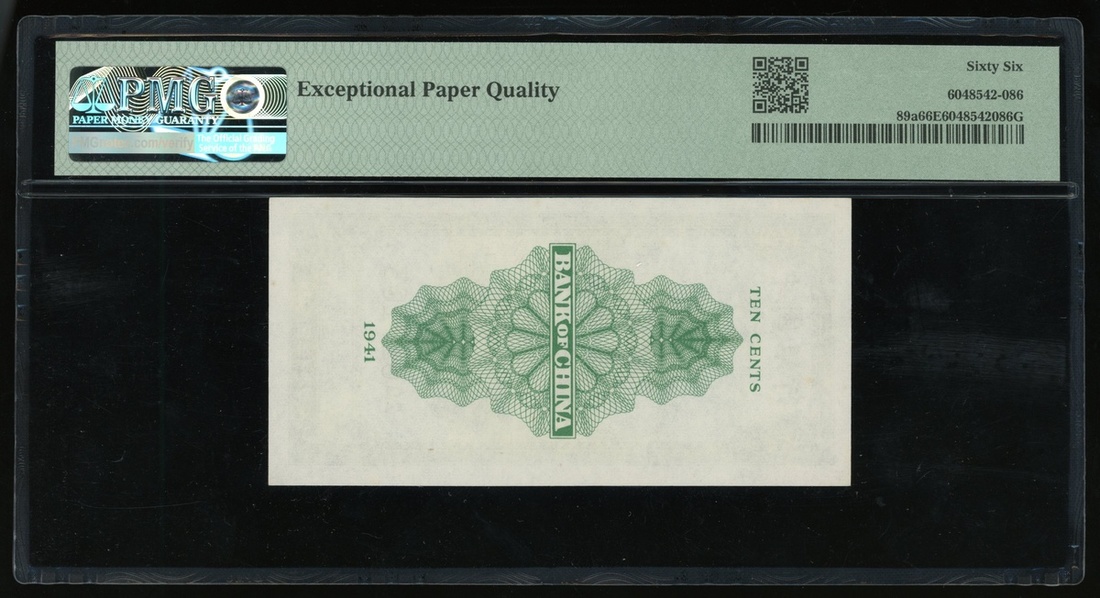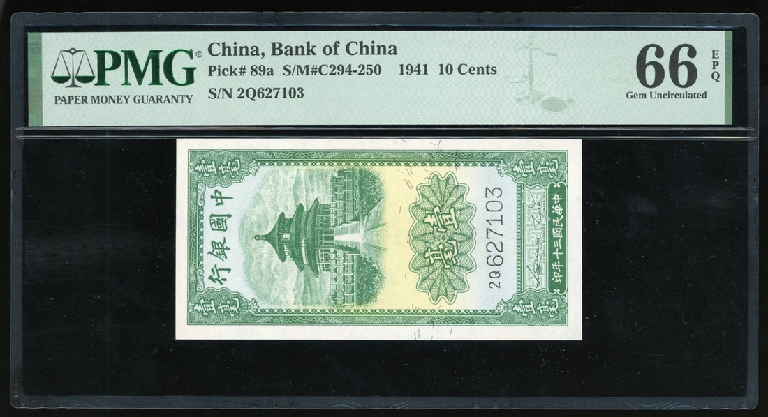 Bank of China, 10 cents, 1941, serial number 2Q 627103, (Pick 89a), PMG 66EPQ Gem Uncirculated