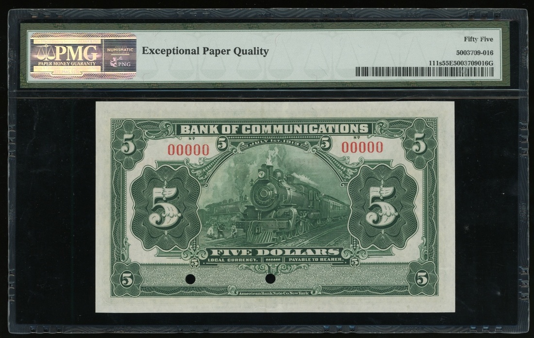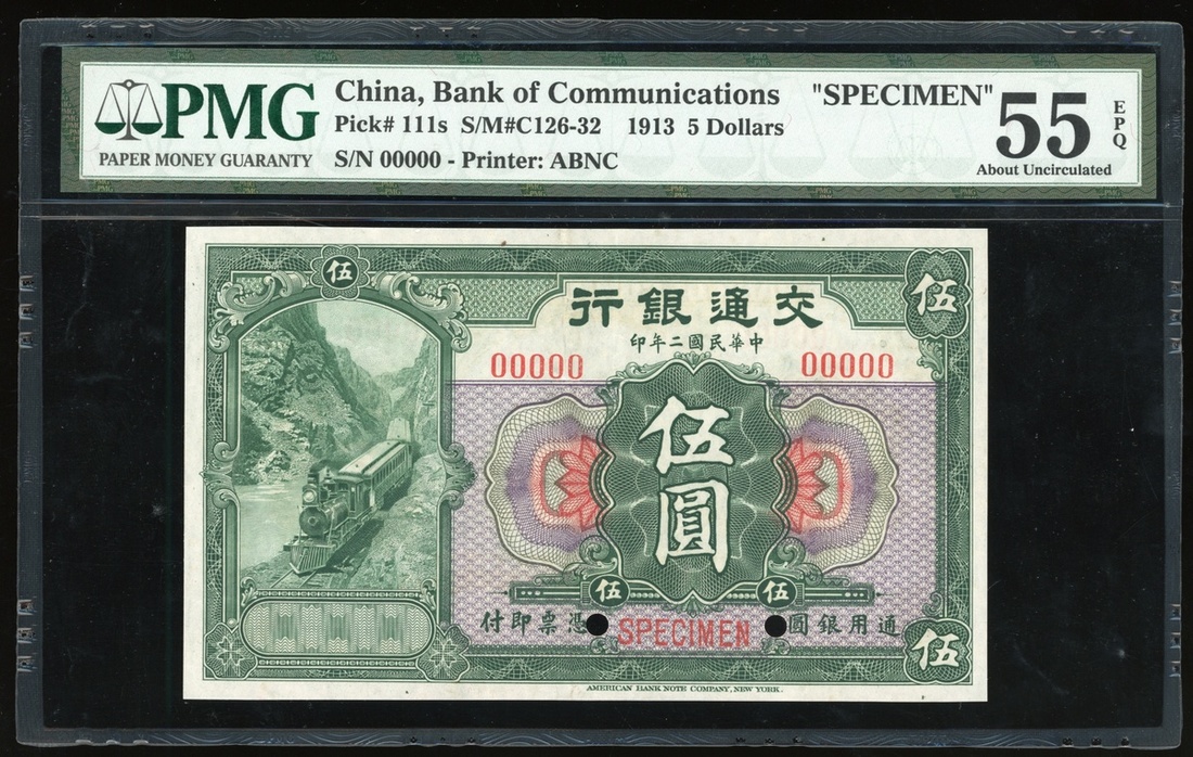 Bank of Communications, China, specimen $5, 1913, serial number 00000, (Pick 111s), PMG 55EPQ About Uncirculated. Quite scarce