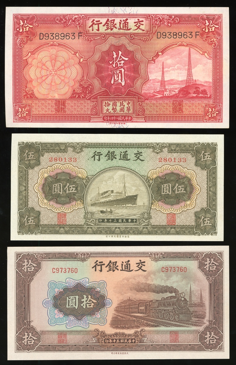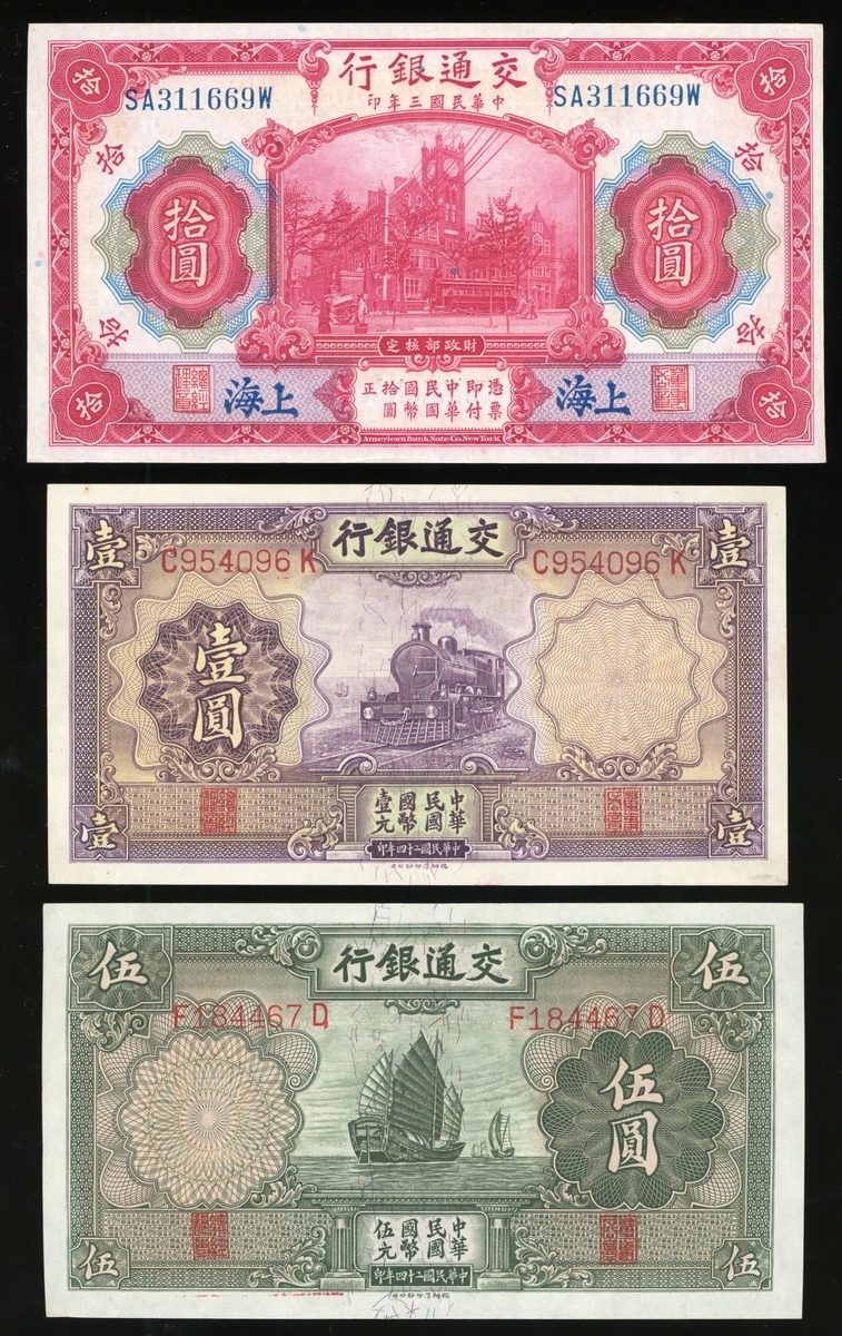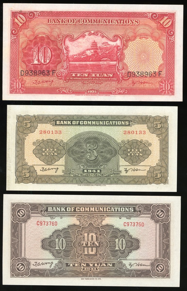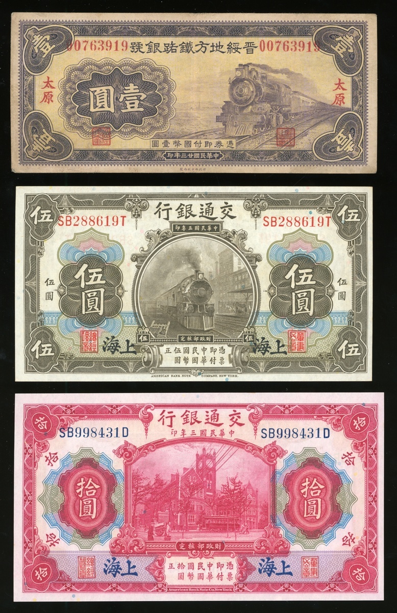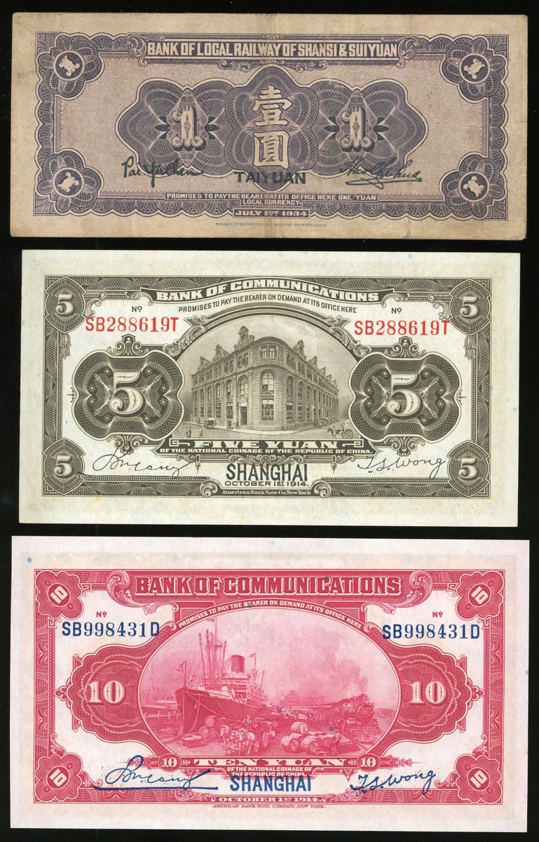 Bank of Communications, China, a group of 9x notes, including 5 yuan and 10 yuan (2) 1914, 1, 5 and 10 yuan 1935, 5 and 10 yuan 1941. Also a Bank of Local Railway of Shansi & Suiyuan 1 yuan 1934,