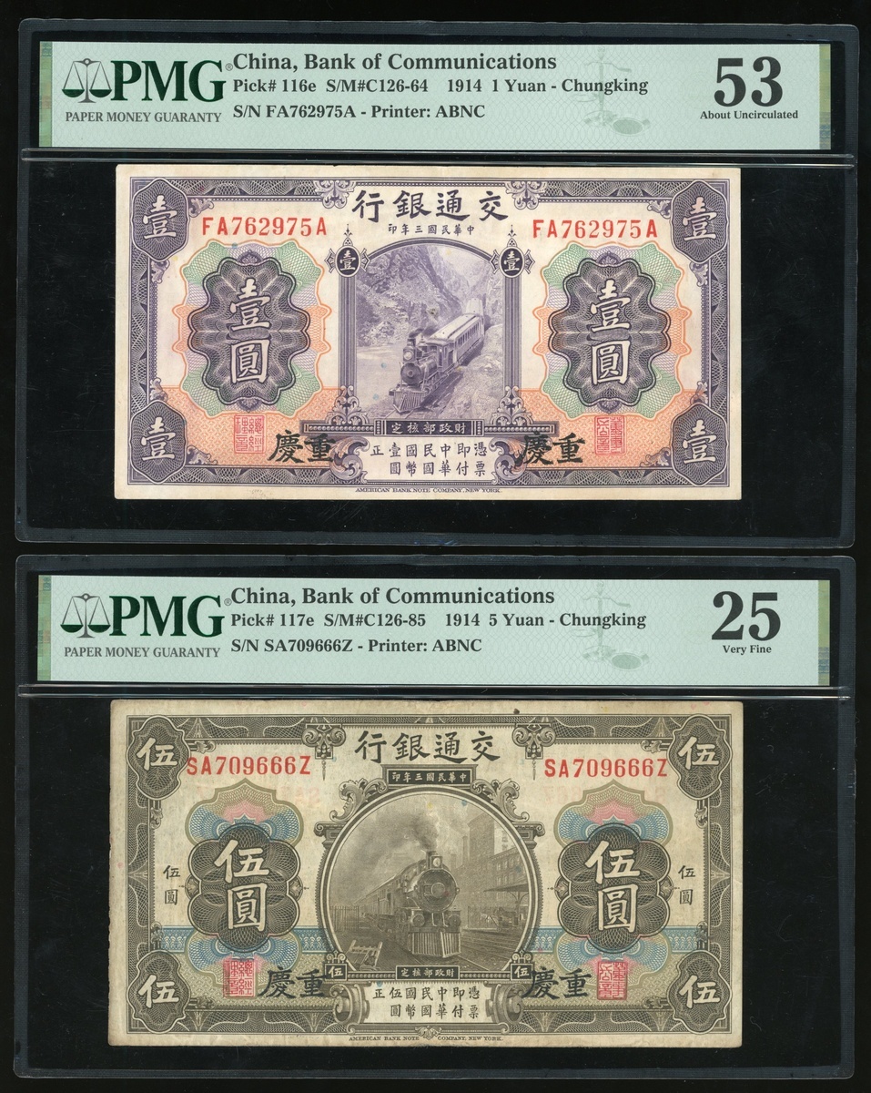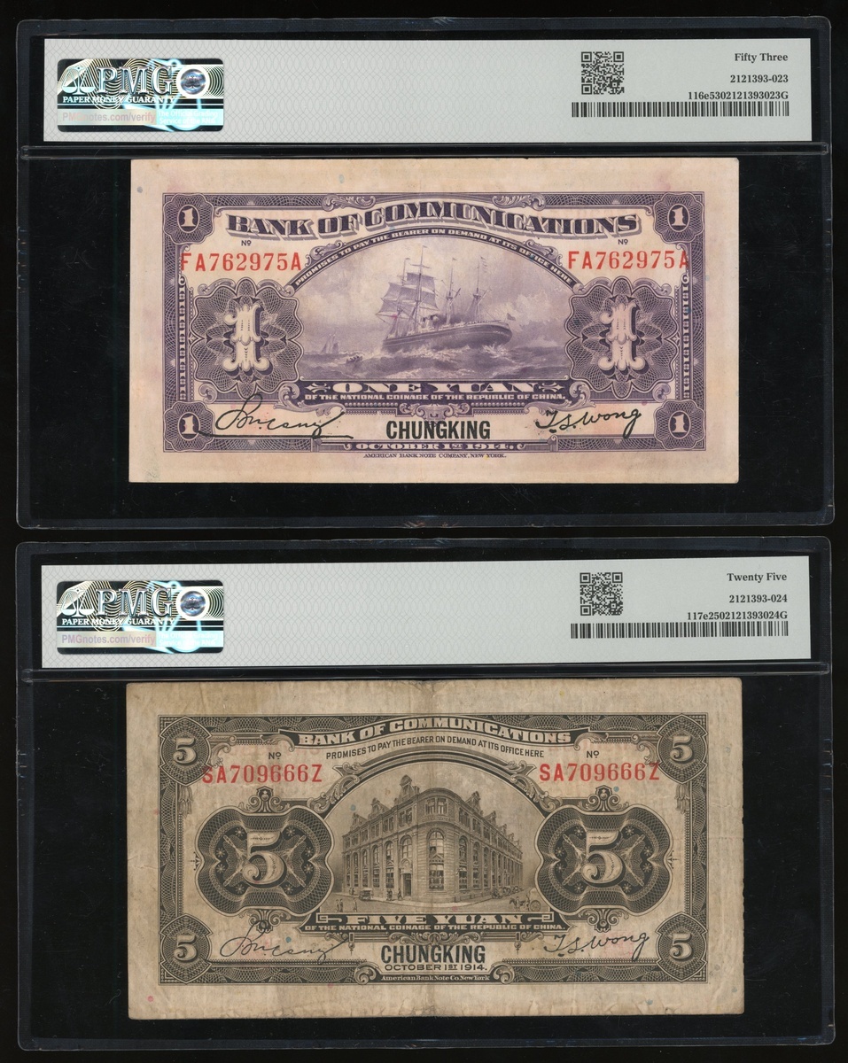 民國三年交通銀行壹圓及伍圓一對,重慶地名,編號FA762975A 及 SA709666Z,分別評PMG 53及25