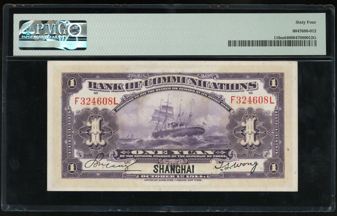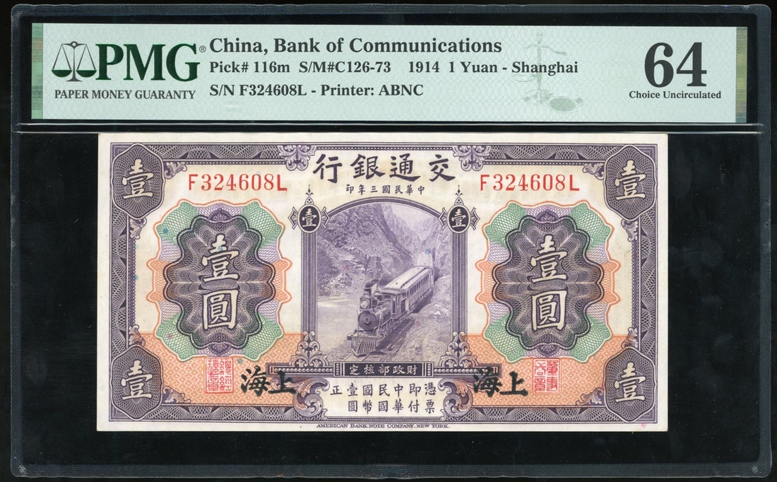 Bank of Communciations, 1 yuan, Shanghai, Year 3(1914), serial number F324608L, (Pick 116m), PMG 64 Choice Uncirculated