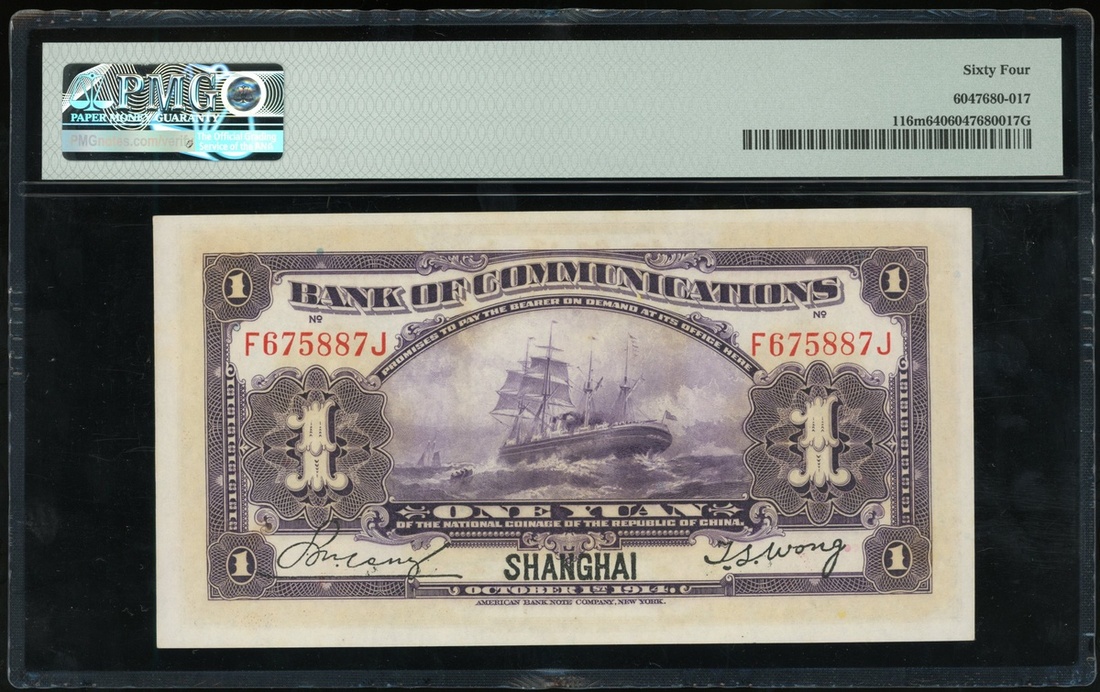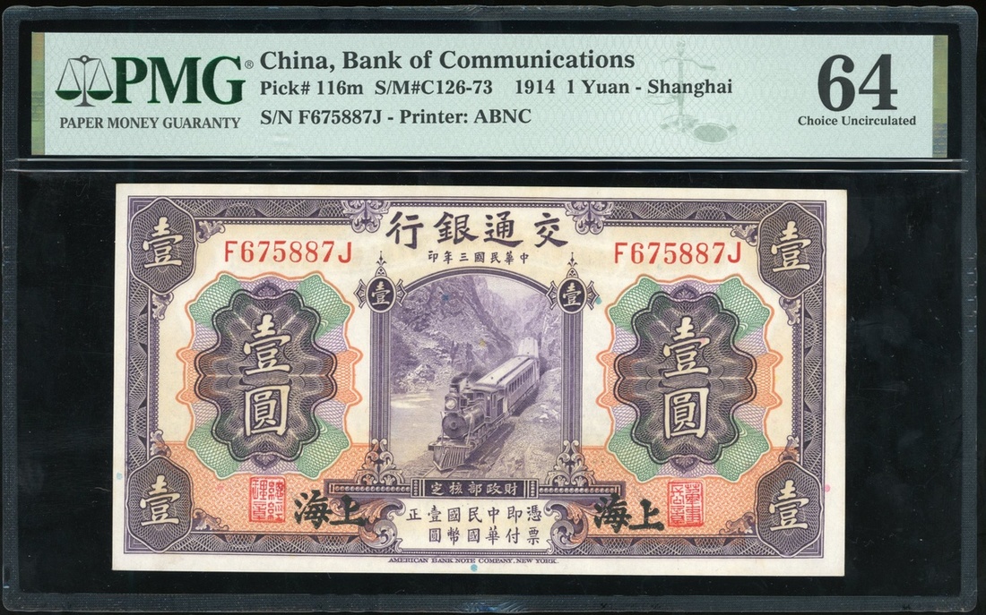 Bank of Communciations, 1 yuan, Shanghai, Year 3(1914), serial number F675887J, (Pick 116m), PMG 64 Choice Uncirculated