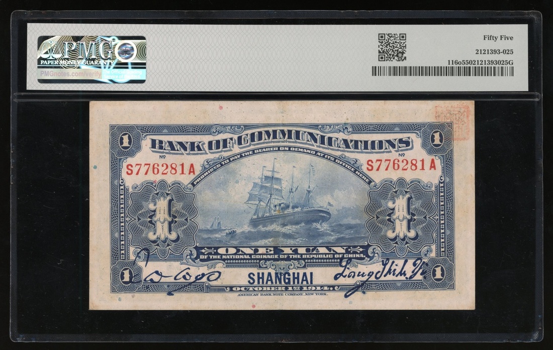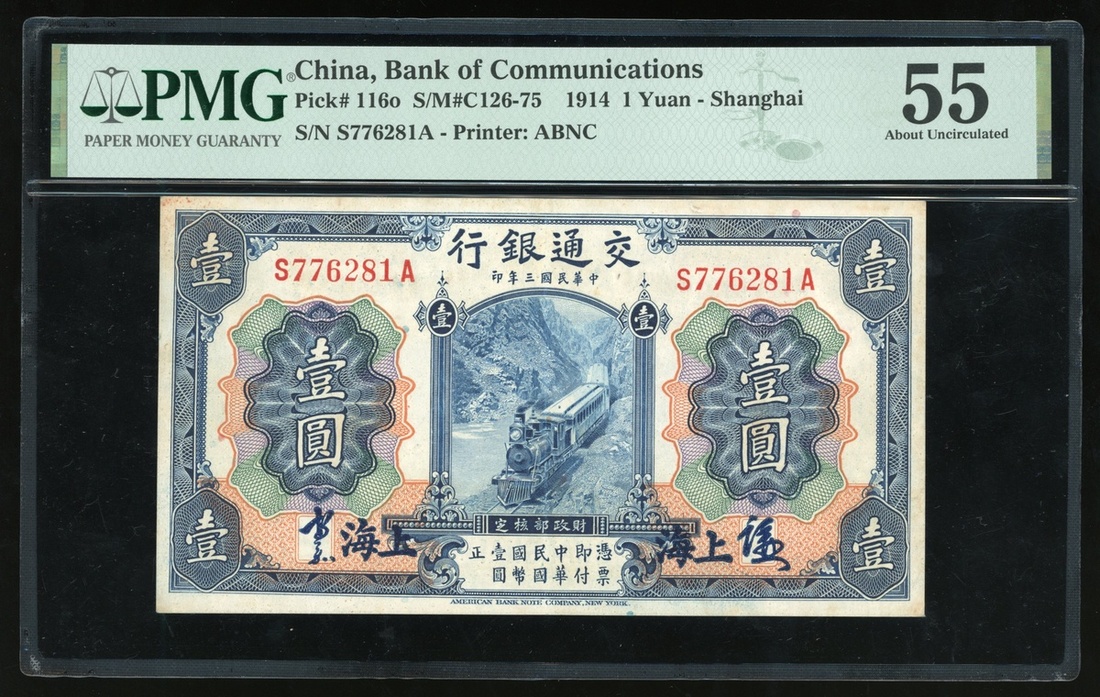 Bank of Communciations, China, 1 yuan, Shanghai, Year 3(1914), serial number S776281A, (Pick 116o), PMG 55 About Uncirculated