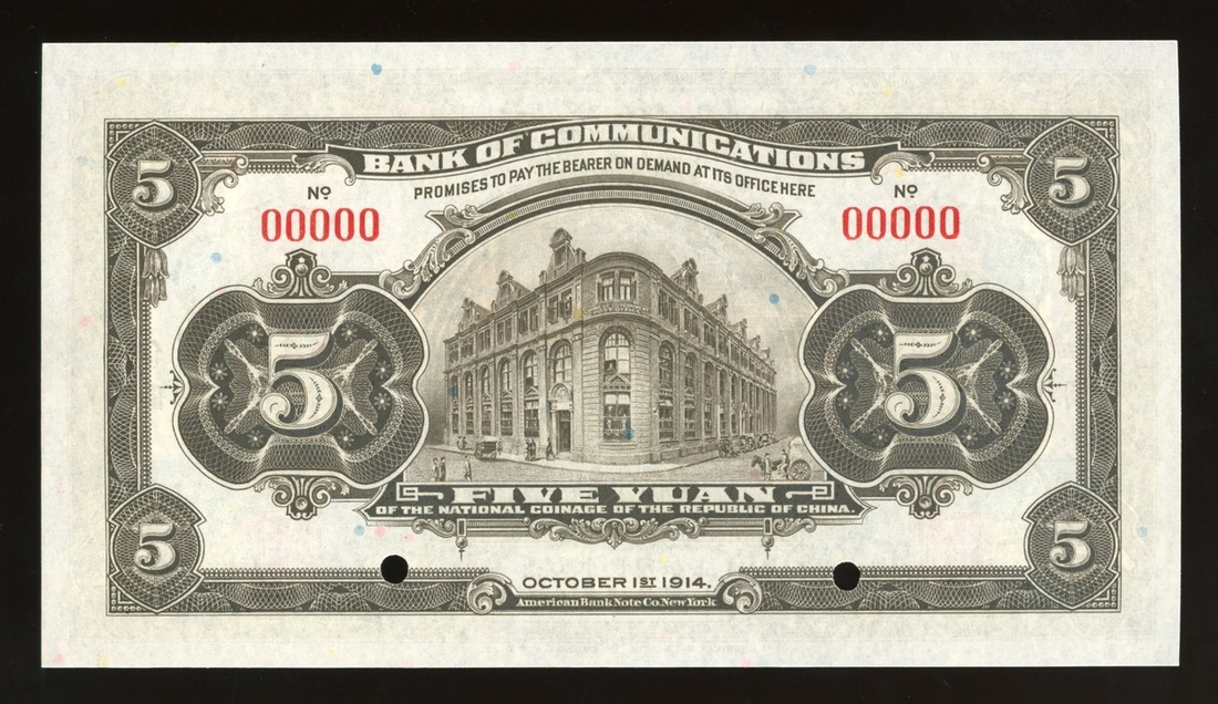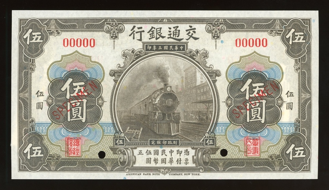 民國三年交通銀行伍圓樣票,編號00000,UNC