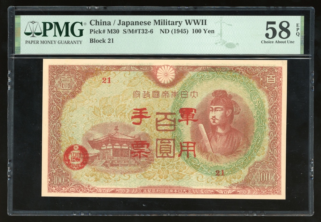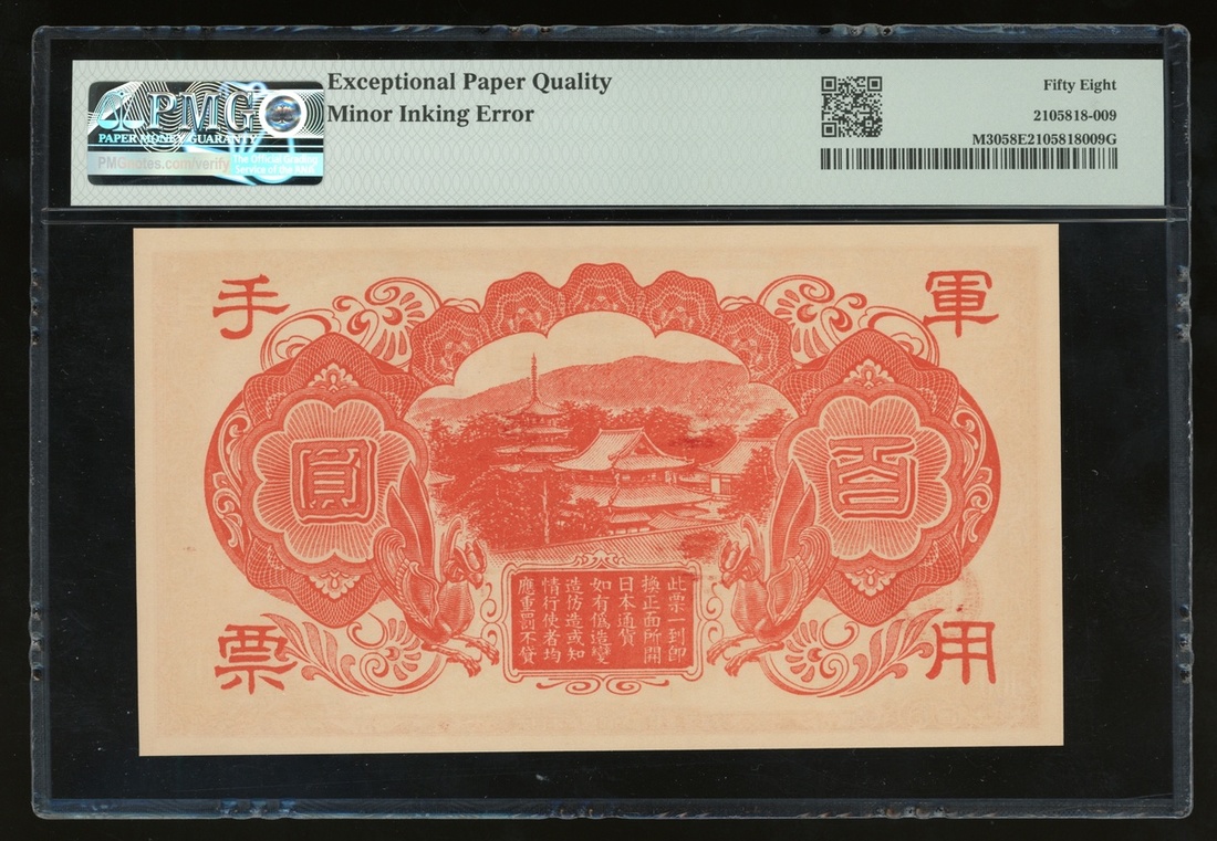 1945年日本軍用手票百圓,輕微印墨錯體,組號21,PMG 58EPQ