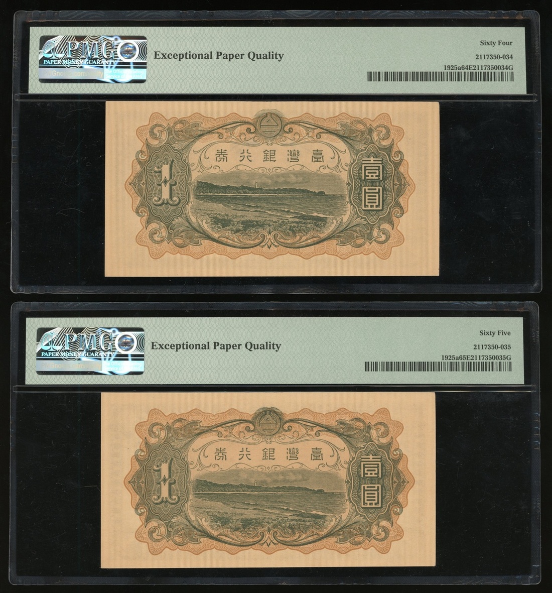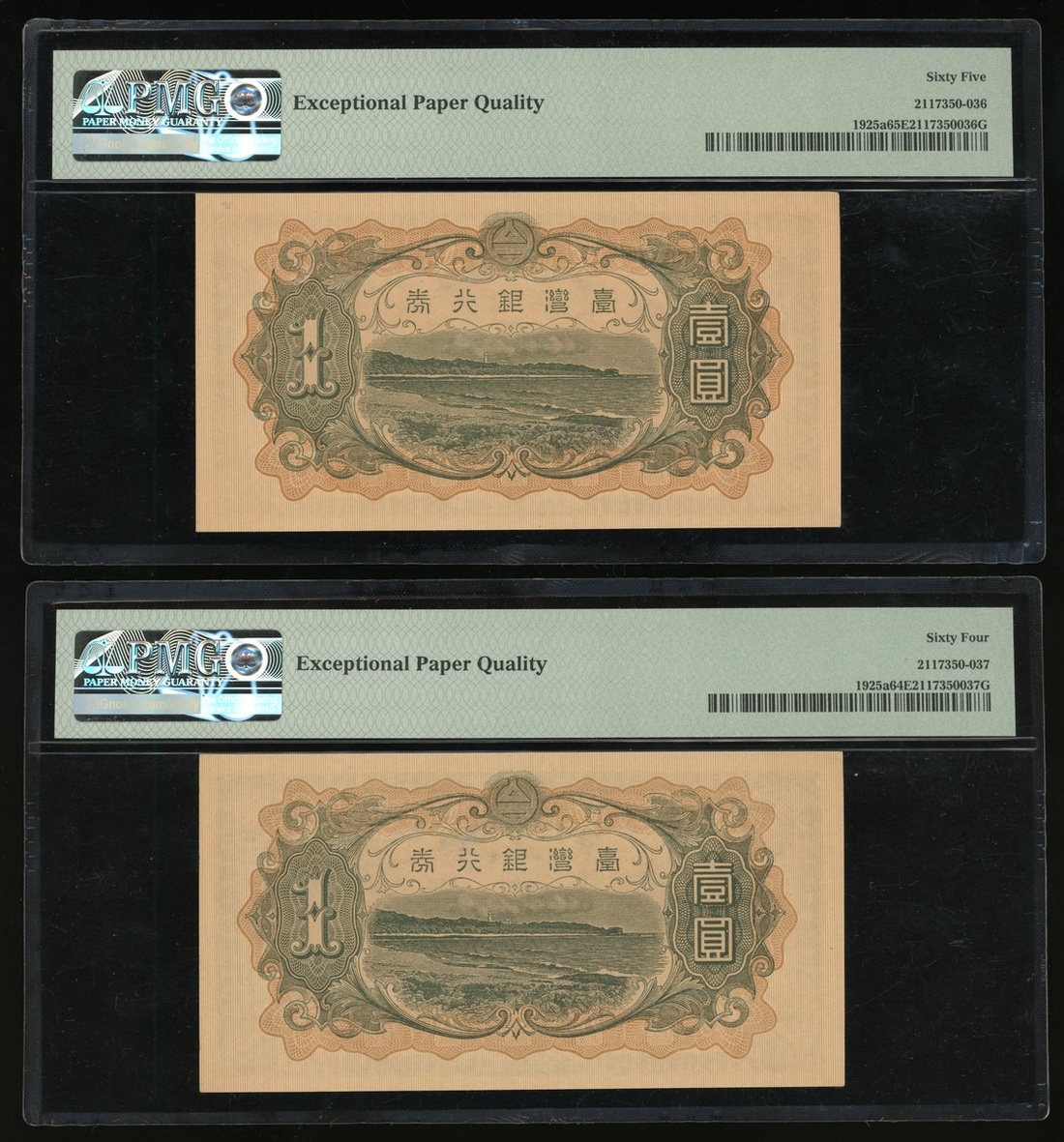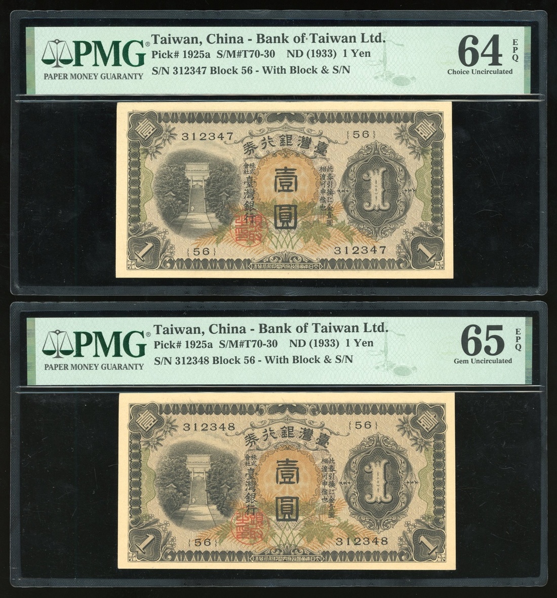 Bank of Taiwan, a consecutive group of 4x 1 yen, ND(1933), serial numbers 312347-50 {56}, (Pick 1925a), graded PMG 64EPQ, 65EPQ, 65EPQ and 64EPQ respectively (4)