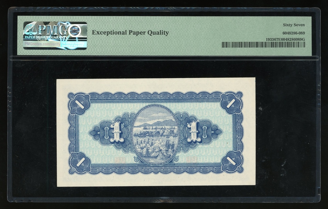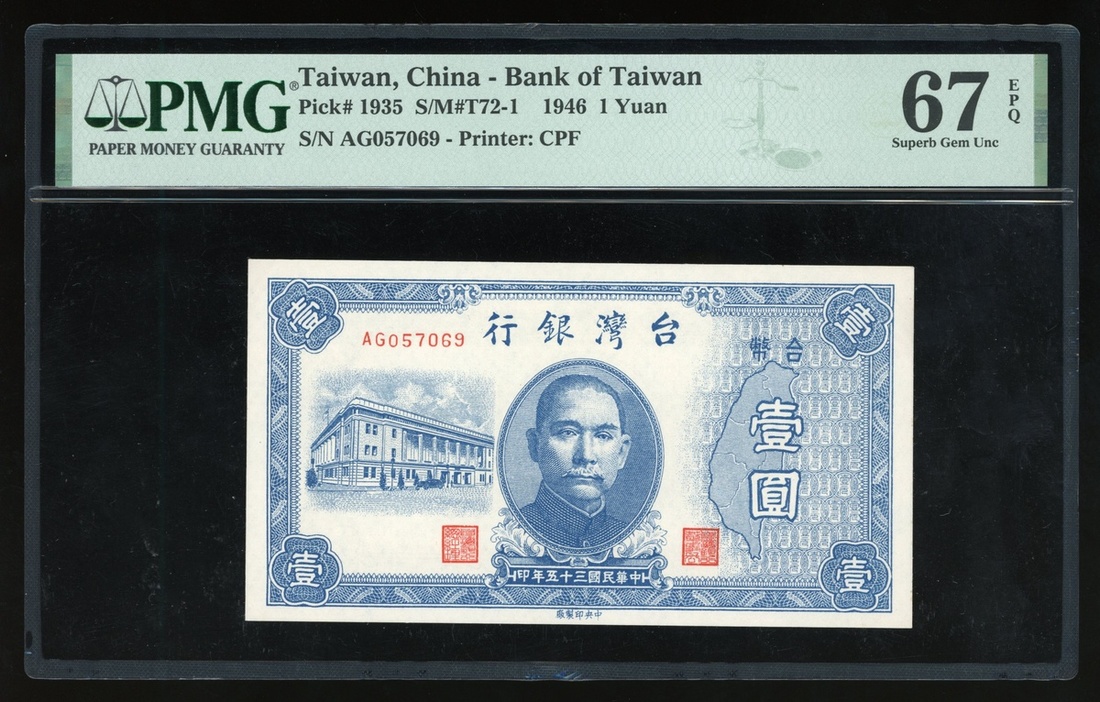 Bank of Taiwan, 1 yuan, Year 35(1946), serial number AG057069, (Pick 1935), PMG 67EPQ Superb Gem Uncirculated, the highest grade in PMG population report.