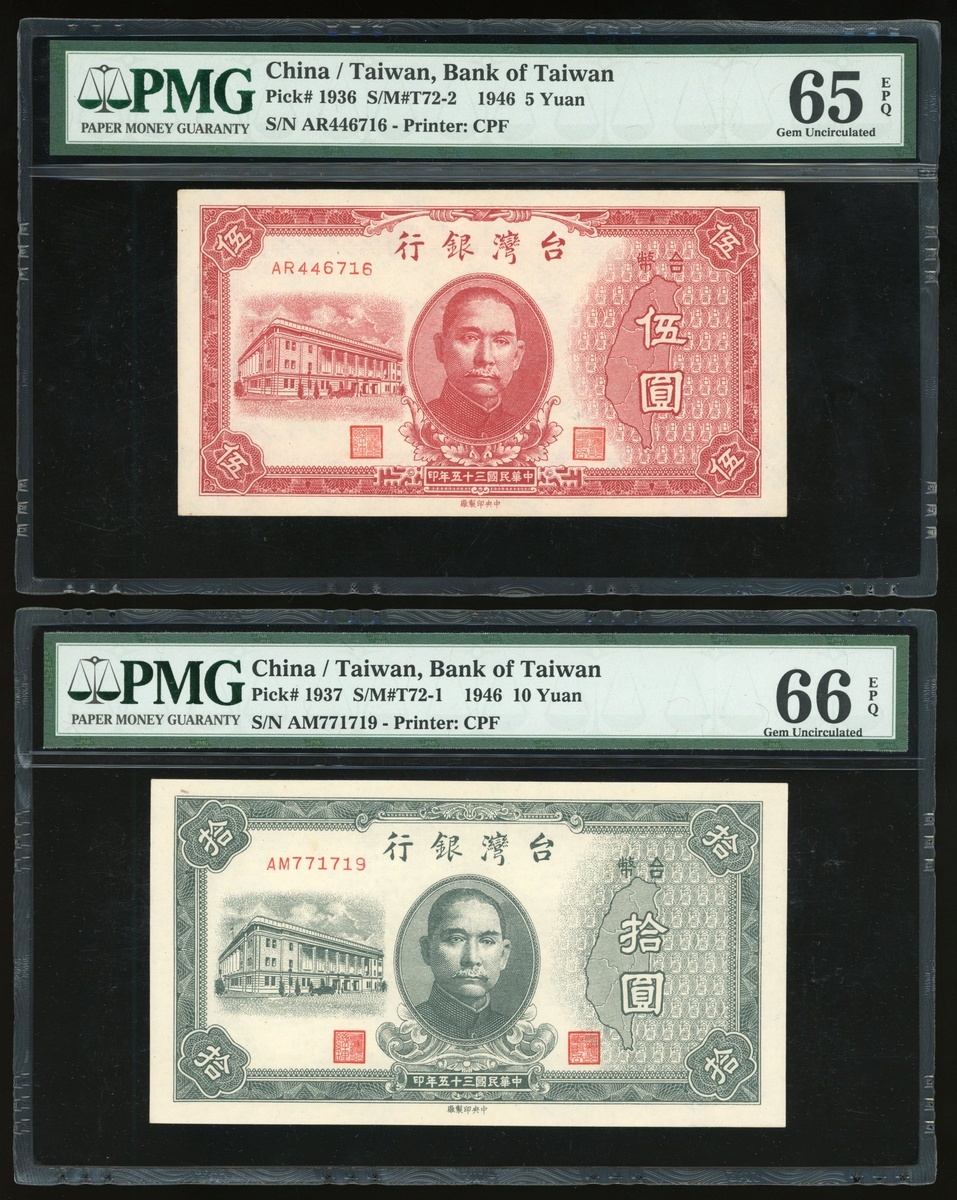 Taiwan, a group of 7 notes, consisting of 5 yuan, 1946, serial number AR446716, a consecutive pair of 10 yuan, 1946, serial number AM771719-20, a consecutive pair of 50 yuan, 1970, serial number P249180-81X, 50 yuan, 1972, serial number K569507R and 100 yuan, 1972, serial number G959818N,