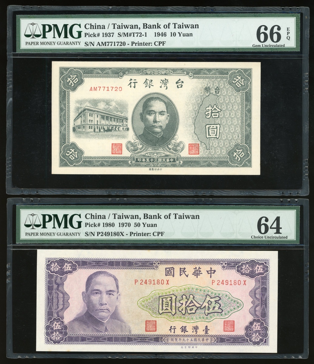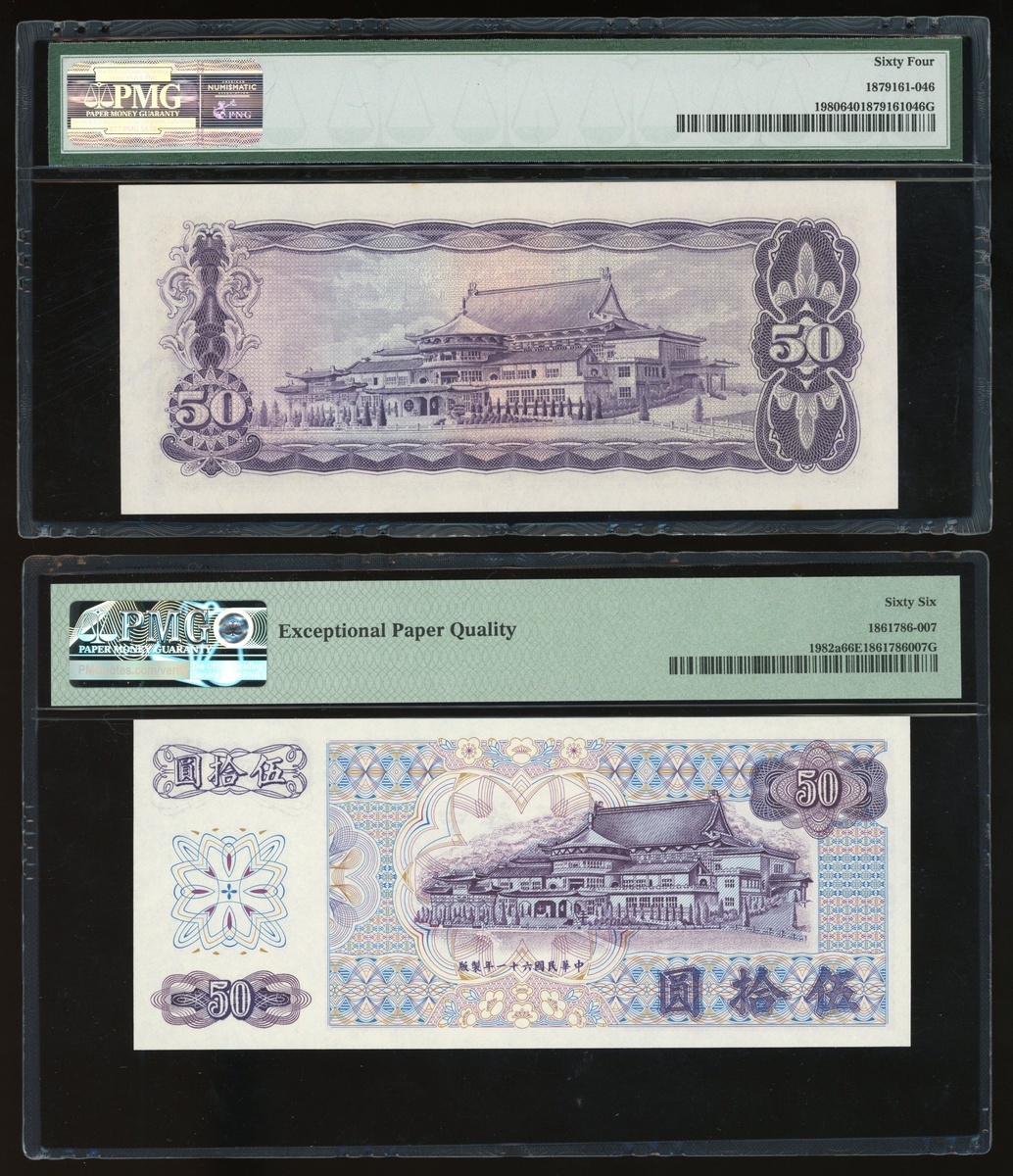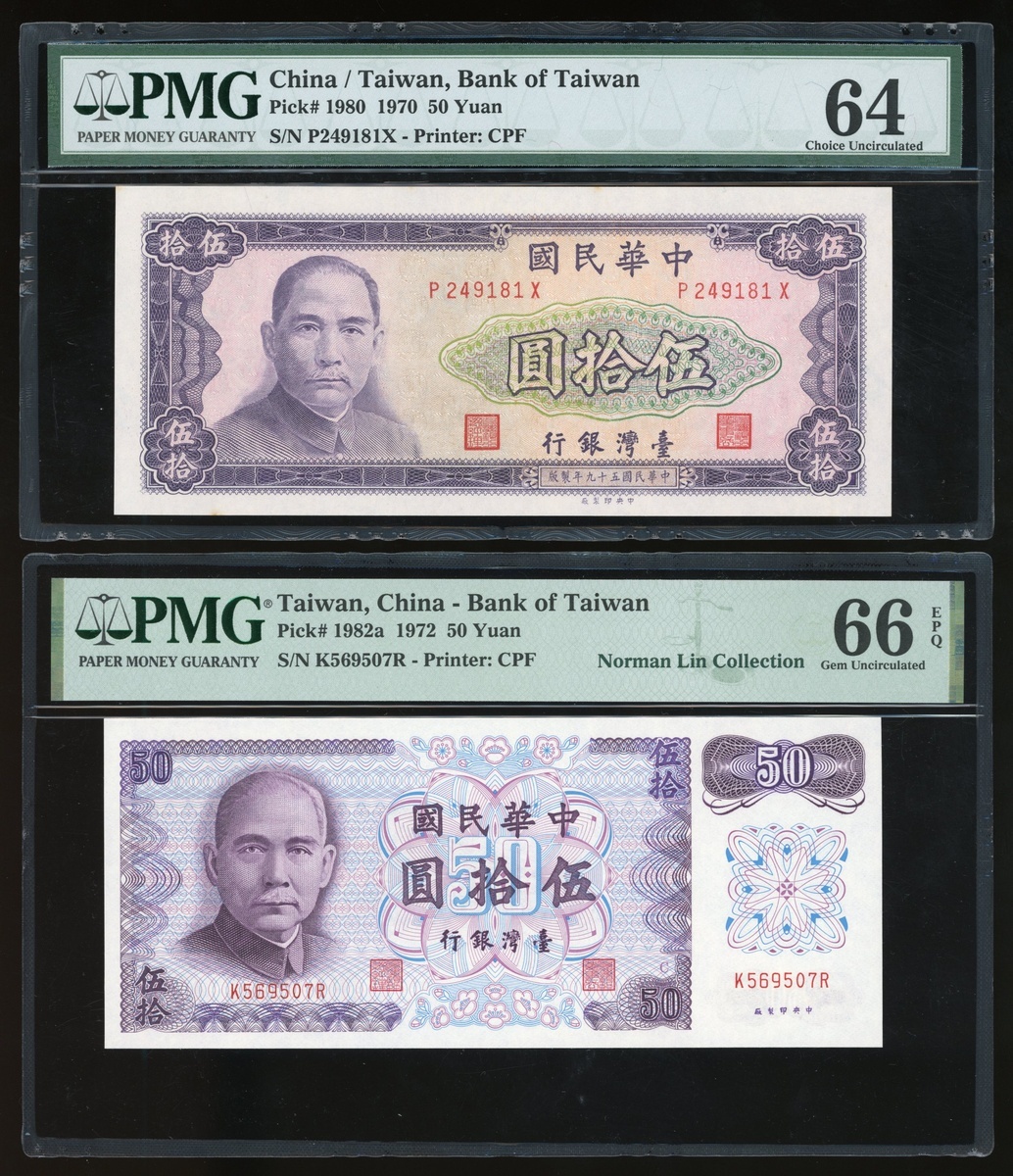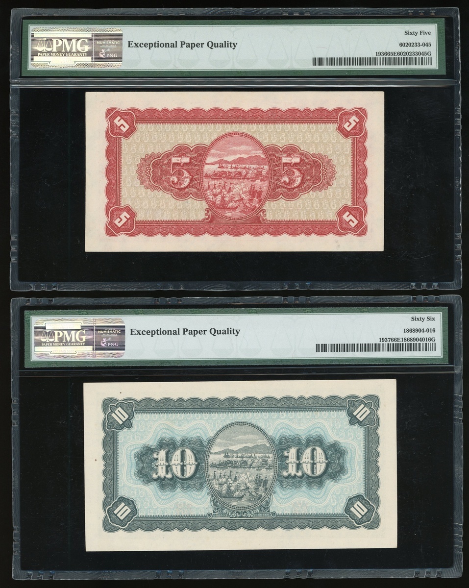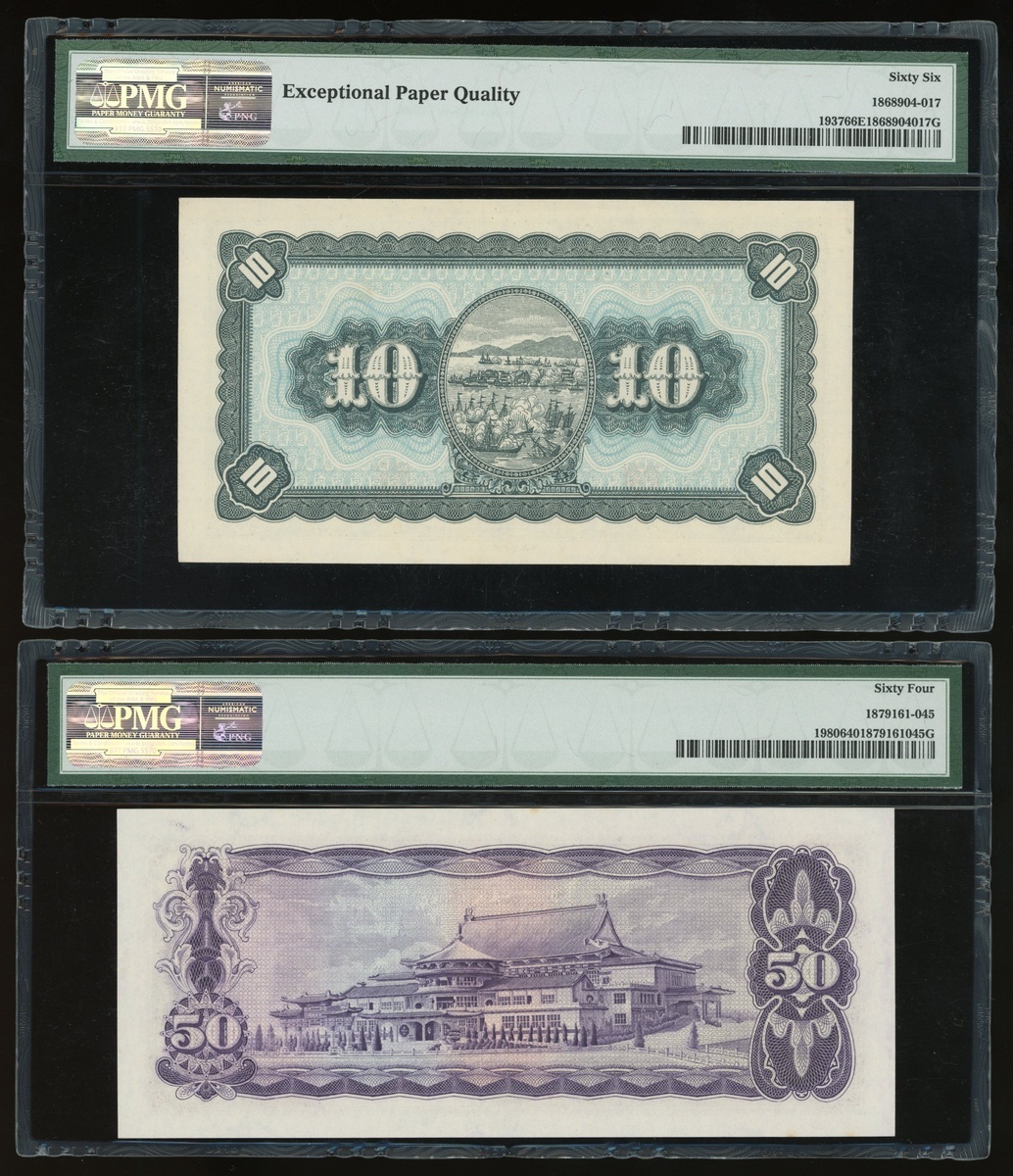 (Pick 1936, 1937, 1980, 1982a, 1983a), all PMG graded, 5 yuan 65EPQ, 1970 50 yuan both 64, the rest 66EPQ.(7)