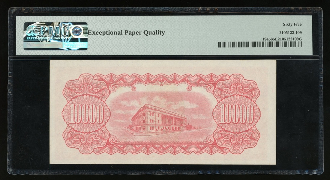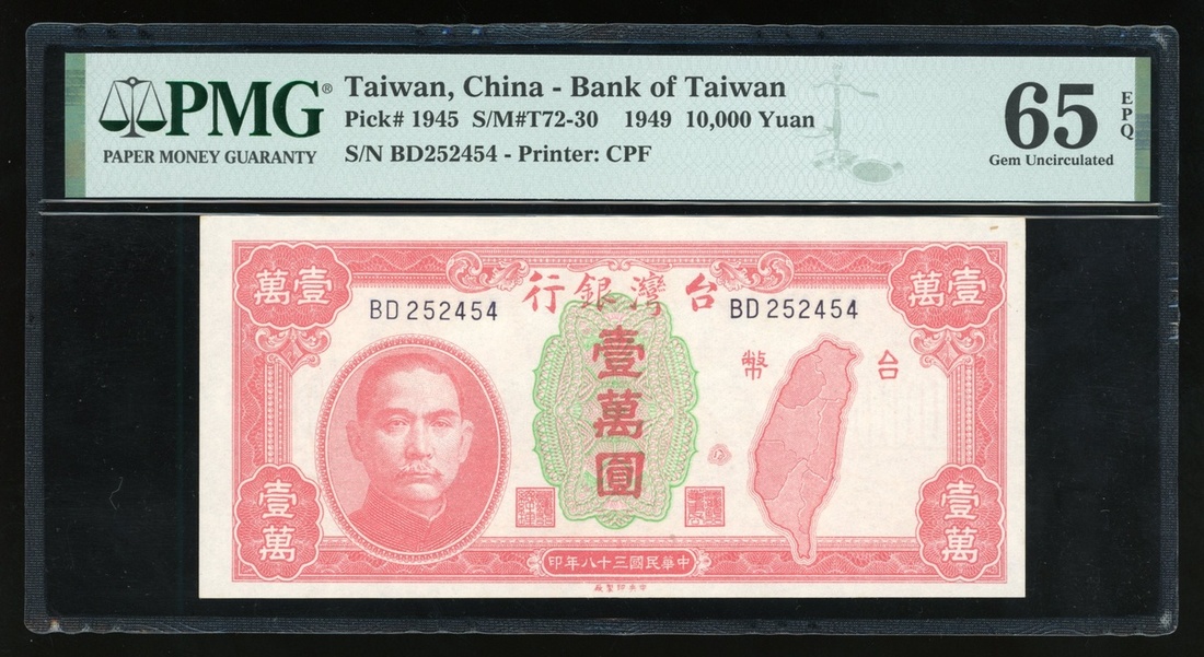 Bank of Taiwan, 10000 yuan, Year 38(1949), serial number BD252454, (Pick 1945), PMG 65EPQ Gem Uncirculated.
