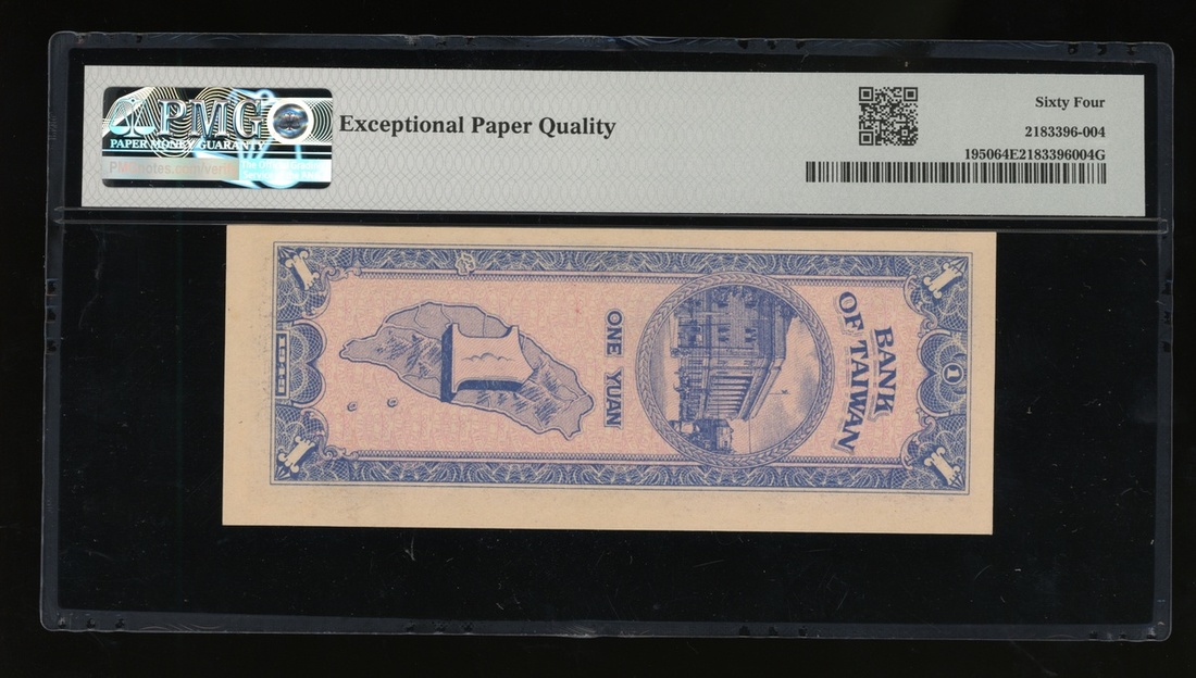 Bank of Taiwan, 1 yuan, Year 38(1949), serial number X900804K, (Pick 1950), PMG 64EPQ Choice Uncirculated.