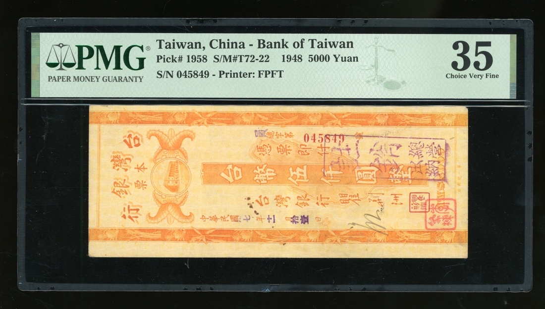 民國三十七年台灣銀行本票伍仟圓,編號045879,右下加蓋注銷,PMG 35,輕微銹潰