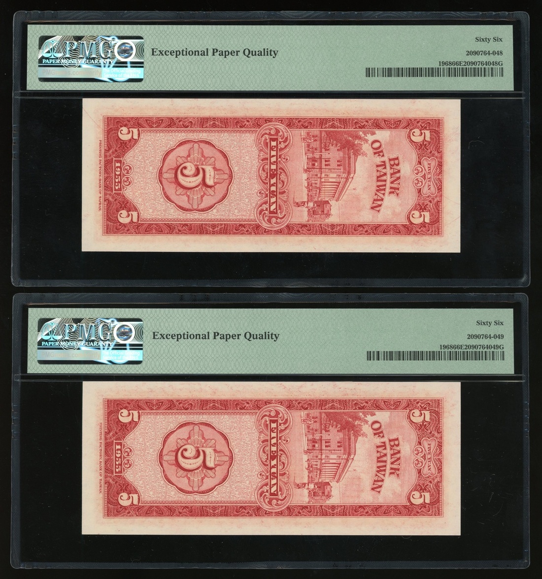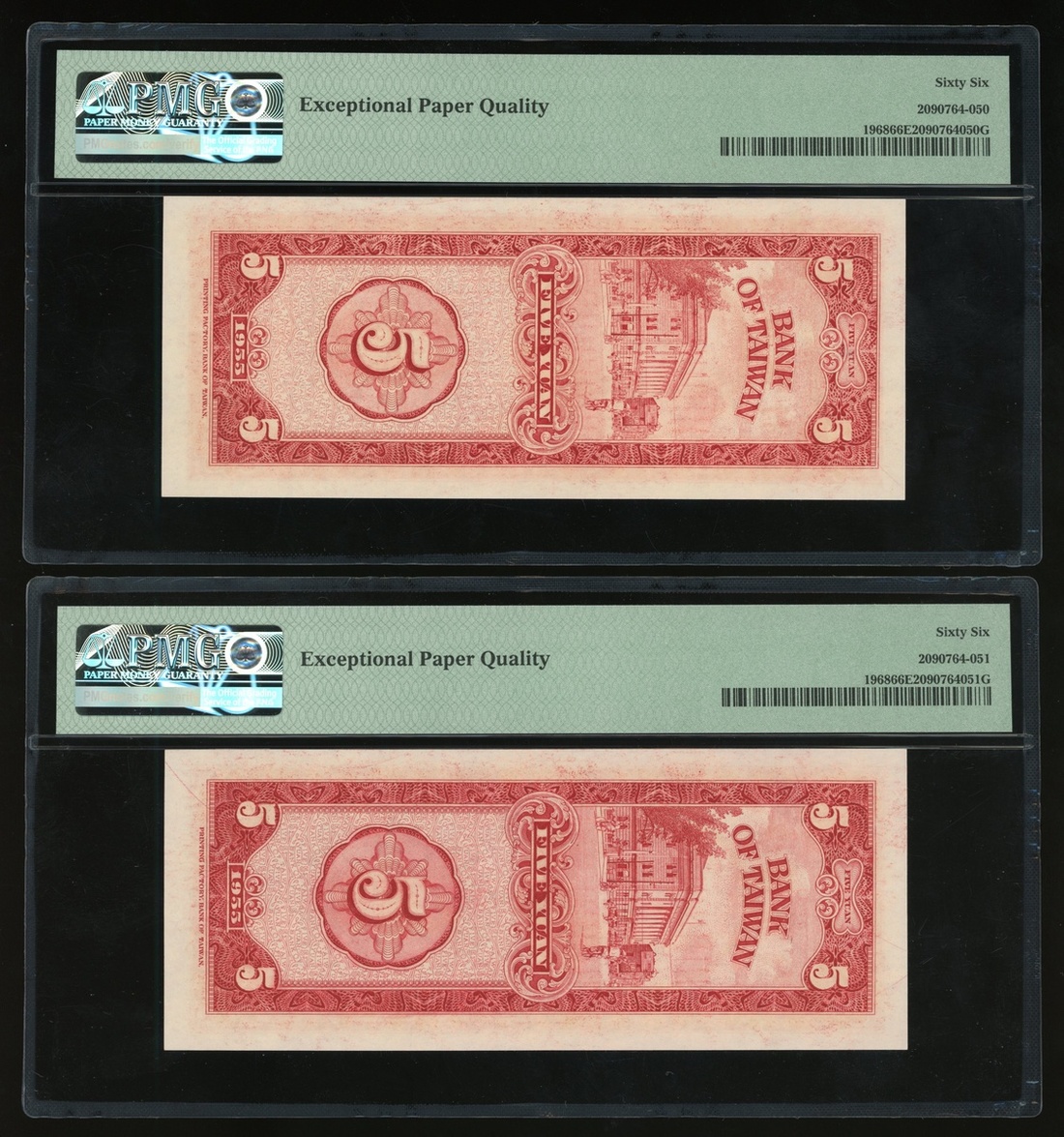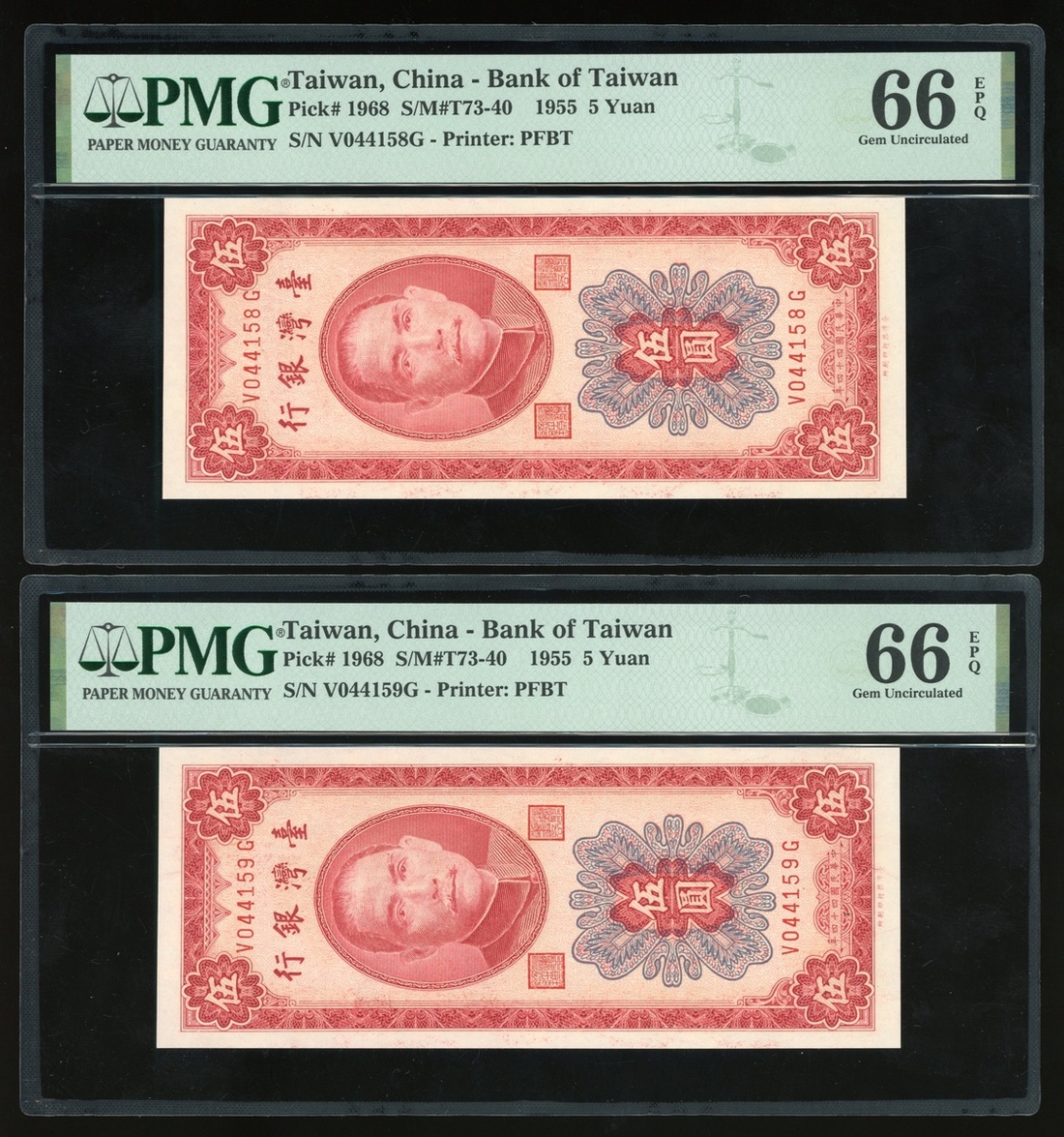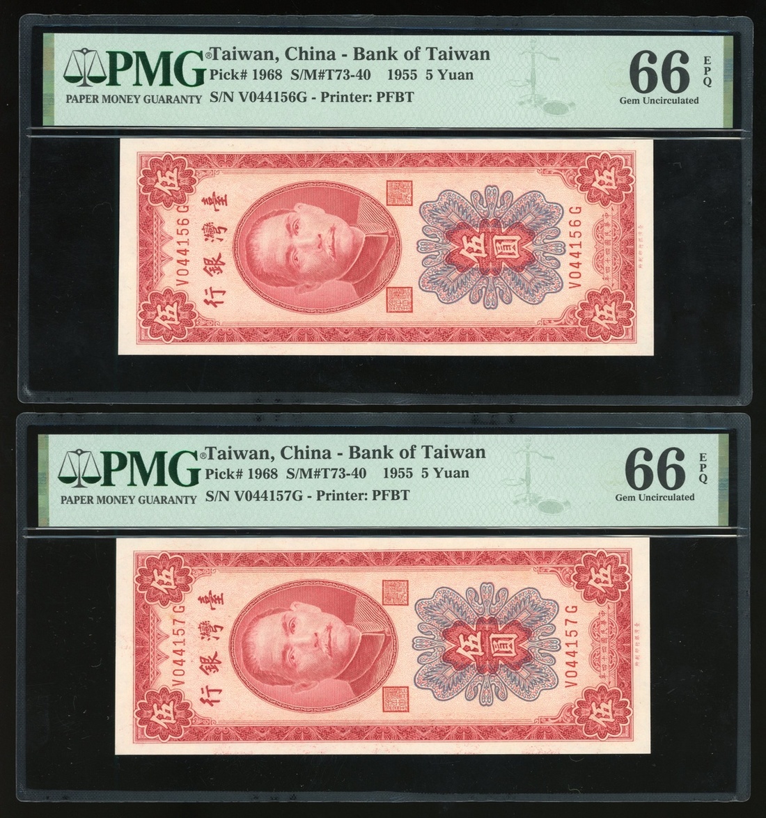 民國四十四年台灣銀行伍圓連號一對,編號V044156G-160G,均PMG 66EPQ